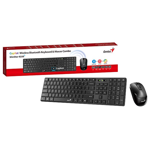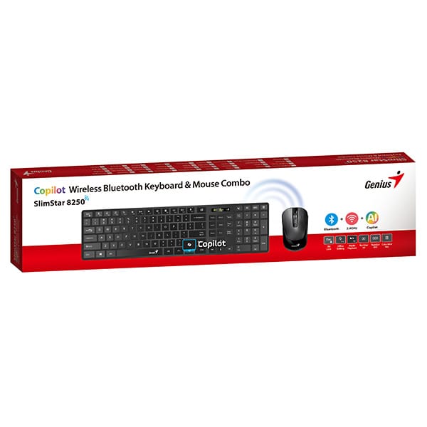 Mysz optyczna o rozdzielczości 1200 DPI zapewnia precyzyjne sterowanie kursorem podczas obsługi programów, przewijania dokumentów i przeglądania internetu. Również na myszy znajduje się dedykowany przycisk Copilot do błyskawicznej aktywacji asystenta AI. Zestaw oferuje podwójną łączność bezprzewodową: Bluetooth 5.0 oraz 2,4 GHz z odbiornikiem USB, z zasięgiem do 10 metrów. Dzięki szerokiej kompatybilności z Windows 10 i 11, macOS, ChromeOS, iOS, iPadOS, Android oraz Smart TV możesz wygodnie sterować urządzeniami także z większej odległości.