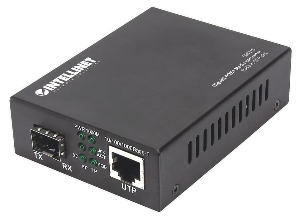Intellinet Gigabit Poe+ Media Converter, 1 X 1000Base-T Rj45 Port To 1 X Sfp Port, Poe+ Injector (Euro 2-Pin Plug)