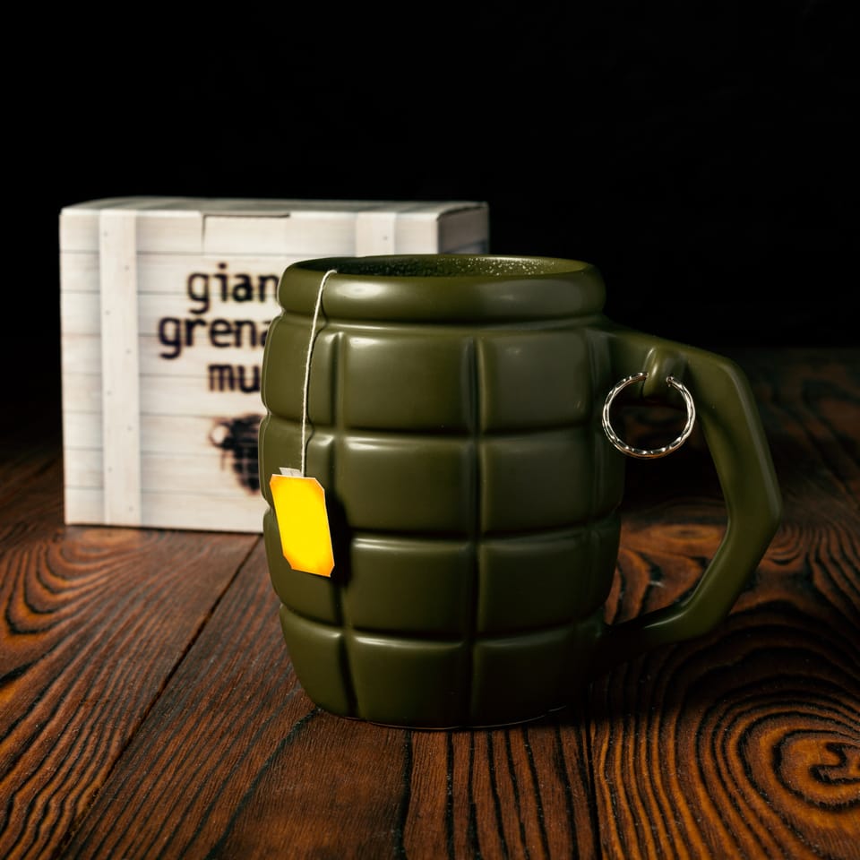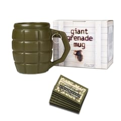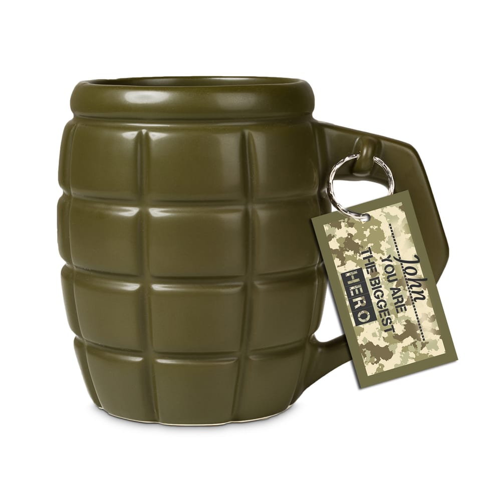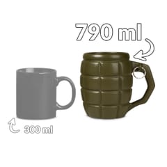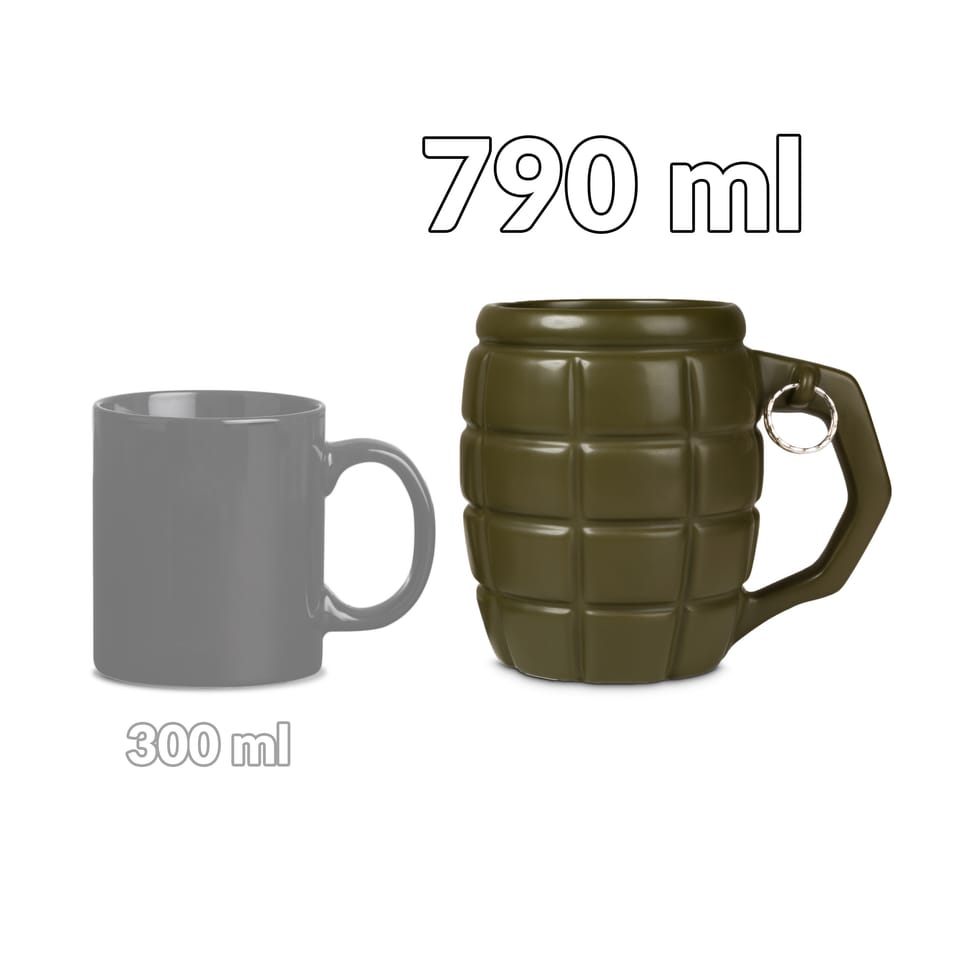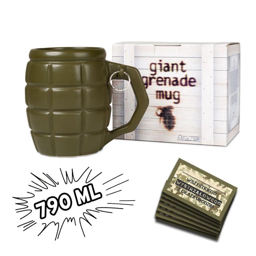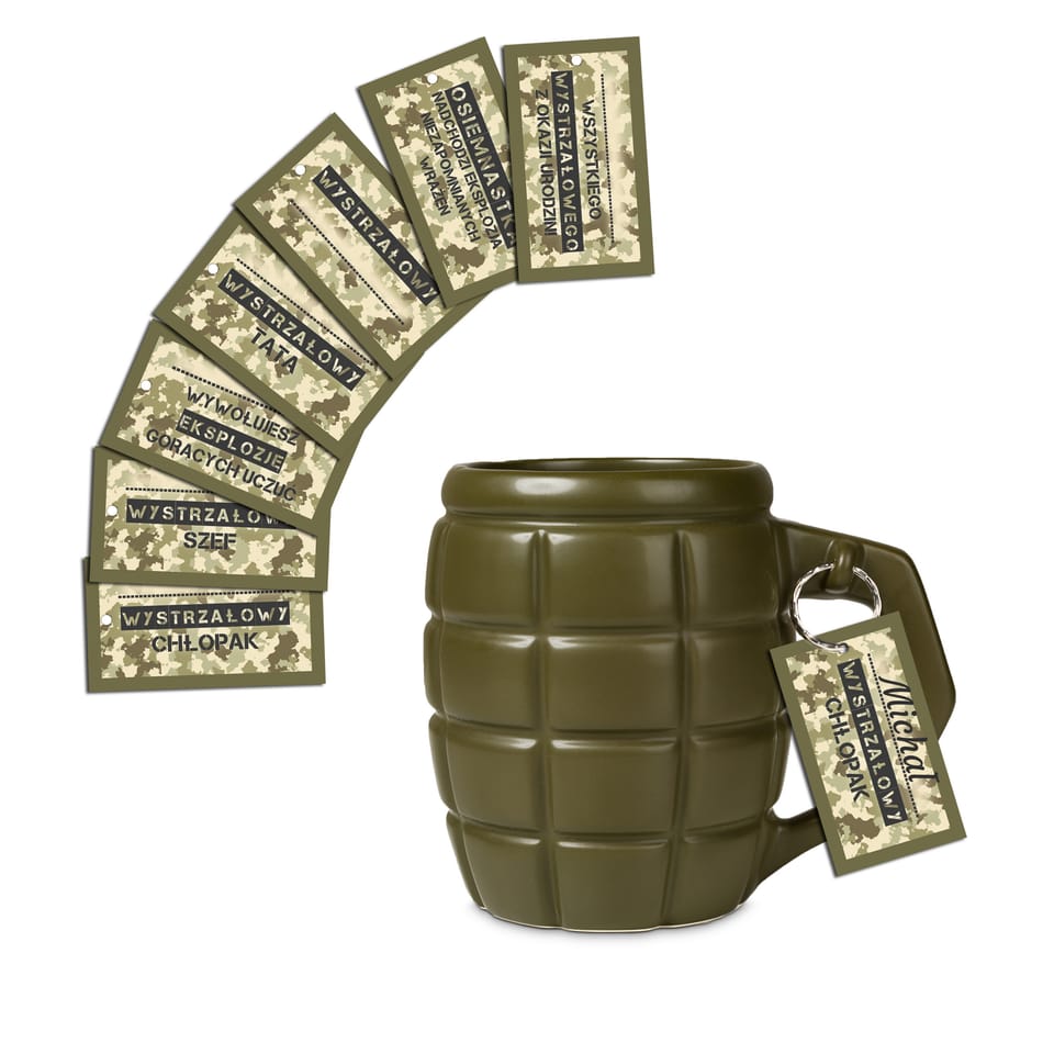 Kubek wzbudzający respekt Co jest lepsze od zwykłego kubka? Gigantyczny kubek, który pomieści Twój ulubiony napój i pozwoli Ci cieszyć się nim dłużej! Gdy dodamy do tego kształt granatu, będzie wiadomo, że jego właścicielem nie może być nikt zwyczajny.Paradując z granatem w rękach, automatycznie wzbudzisz u innych podwójny respekt i możesz być pewny że nikt, ale to nikt, nie ośmieli się z Tobą nie zgodzić… Oryginalny kubek i kufel do piwa w jednym Gigantyczny Kubek Granat sprawdzi się nie tylko przy piciu ulubionej kawy czy herbaty. Ten wystrzałowy gadżet zmieści piwo z pianką, dlatego stanie się idealnym, wzbudzającym respekt towarzyszem spotkań ze znajomymi.W lecie pozwoli Ci cieszyć się zimnym napojem, a w zimie - pysznym grzańcem. Dla wystrzałowych ludzi Gigantyczny Kubek Granat to świetny prezent dla wszystkich wystrzałowych ludzi albo tych, którzy trzymają władzę: taty, chłopaka czy dziadka.To pomysłowy prezent dla osób, które piją duże ilości ciepłych napojów i cenią sobie oryginalność.Sprawdzi się jako dowcipny prezent dla szefa (chodząc z granatem po biurze na pewno zyska podwójny szacunek), nauczyciela czy znajomego wojskowego, który lubi swoją pracę. Spodoba się także wszystkim fanom tematyki wojennej lub gier militarnych. Militarny prezent dla niego To oryginalny upominek na Dzień Chłopaka, Dzień Mężczyzny, imieniny lub inne małe święto.Dzięki dołączonym zawieszkom na różne okazje, Twój prezent nabierze jeszcze bardziej osobistego charakteru.