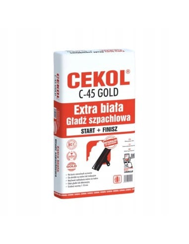 CEKOL C-45 jest doskonałym materiałem do przygotowywania ścian i sufitów wewnątrz budynków przed malowaniem, tapetowaniem itp. Także do renowacji starych tynków, tynkowania całych ścian, szpachlowania płyt gipsowo-kartonowych. Gładź szpachlowa CEKOL C-45 umożliwia wykonanie bardzo gładkich powierzchni. Dzięki unowocześnionej formule, doskonale sprawdza się zarówno w aplikacji ręcznej, jak i maszynowej przy użyciu odpowiednich narzędzi i agregatów.