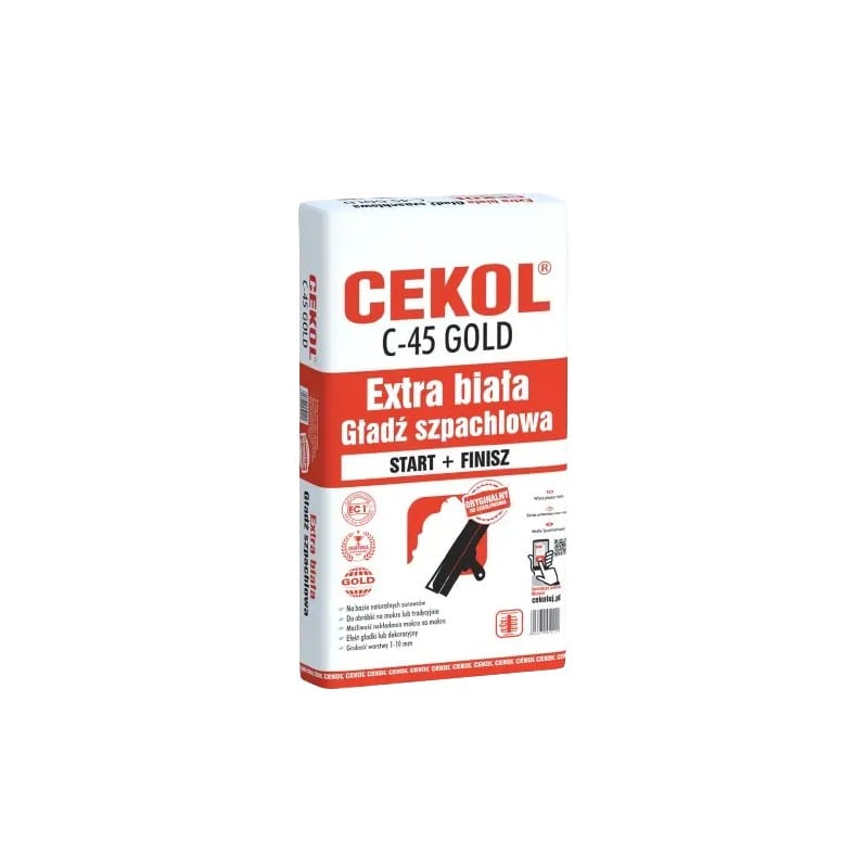 Gładź Cekol C45 jest doskonałym materiałem do przygotowywania ścian i sufitów wewnątrz budynków przed malowaniem, tapetowaniem itp. Także do renowacji starych tynków, tynkowania całych ścian, szpachlowania płyt gipsowo-kartonowych. Gładź szpachlowa Cekol C-45 umożliwia wykonanie bardzo gładkich płaszczyzn. Dzięki unowocześnionej formule nadaje się do nakładania ręcznego oraz maszynowego.
