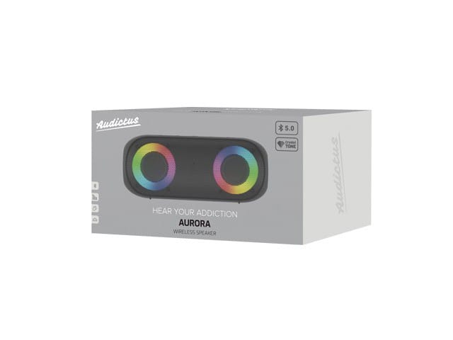 Niezawodne połączenieGłośnik obsługuje technologię Bluetooth 5.0, która gwarantuje stabilne połączenie oraz niezwykle szybki transfer danych. Sparuj swoje urządzenie z głośnikiem Audictus Aurora i nie obawiaj się zakłóceń!Czysty dźwięk i mocny bassW niewielkich rozmiarów konstrukcji umieszczono niezwykle wydajne przetworniki, które zapewniają wysokiej jakości dźwięk i doskonałe odwzorowanie zarówno niskich, jak i wysokich tonów. Wzmocniony bas dodaje muzyce głębi, która zagwarantuje pełnię wrażeń podczas słuchania.Wytrzymała bateriaZ głośnikiem Audictus Aurora przetańczysz całą imprezę bez obaw o nagłe rozładowanie baterii. Akumulator zapewnia około 20 godzin nieprzerwanej rozrywki, a obniżenie głośności do 50% wydłuża czas użytkowania o kolejne 10 godzin.Zjawiskowe podświetlenieNa froncie głośnika znajdują się dwa kolorowe pierścienie RGB, które dzięki żywym kolorom i 9 trybom podświetlenia idealnie dopasują się do stylu każdej imprezy i zapewnią słuchaczom niezapomniane wrażenia wizualne.Praktyczne rozwiązaniaGłośnik posiada wbudowany mikrofon i slot kart SD oraz port AUX, dzięki któremu w każdej chwili połączysz się z zewnętrznym źródłem dźwięku, takim jak adapter czy odtwarzacz MP3. Gniazdo wejściowe audio umożliwia podłączenie niemalże każdego urządzenia dźwiękowego.Konstrukcja odporna na wodęAudictus Aurora zapewnia wodoodporność IPX7 do głębokości jednego metra, co pozwala na pozbawioną stresu rozrywkę na świeżym powietrzu. Impreza na basenie? Z Audictus to żaden problem!Dwie możliwości odtwarzaniaZarówno Audictus Aurora, jak i Audictus Aurora Mini generuje dźwięk, który zachwyci nawet najbardziej wymagających słuchaczy. Daj się zaskoczyć!