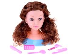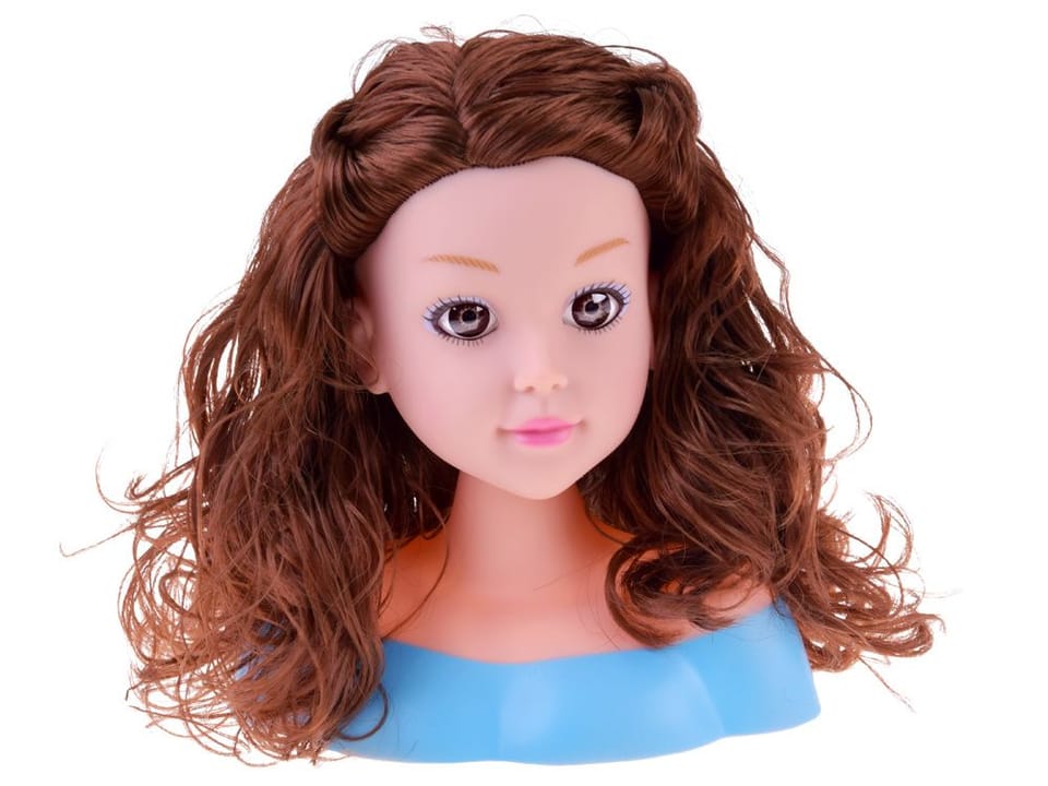 - Głowa lalki - piękna lalka szatynka z długimi, miękkimi włosami, dużymi brązowymi oczami i delikatnym makijażem. Włosy są podatne na czesanie i upinanie, dzięki czemu dziecko może tworzyć dowolne fryzury: kucyki, koki, loki czy proste stylizacje. Całość została umieszczona na stabilnym popiersiu, co ułatwia zabawę i zapobiega przewracaniu. Wymiary: ok. 20 cm x 18 cm.
