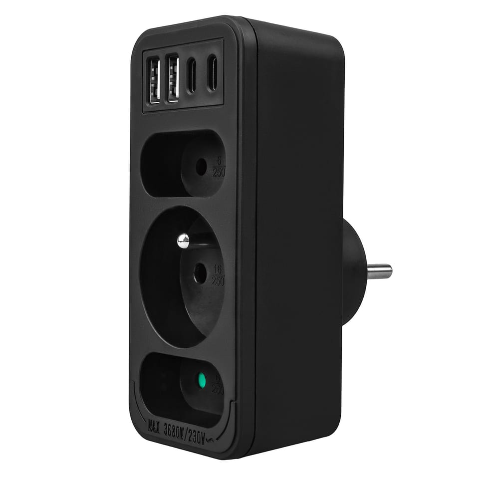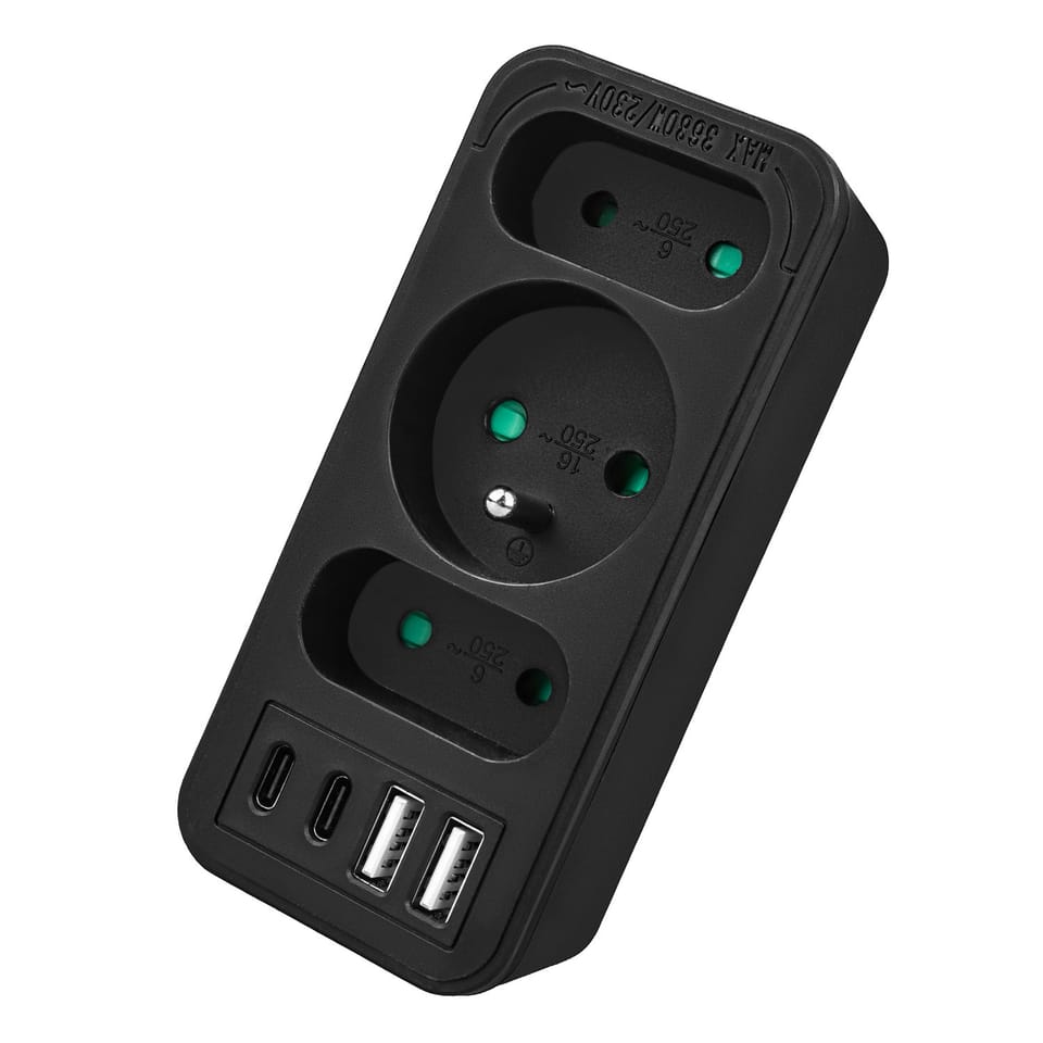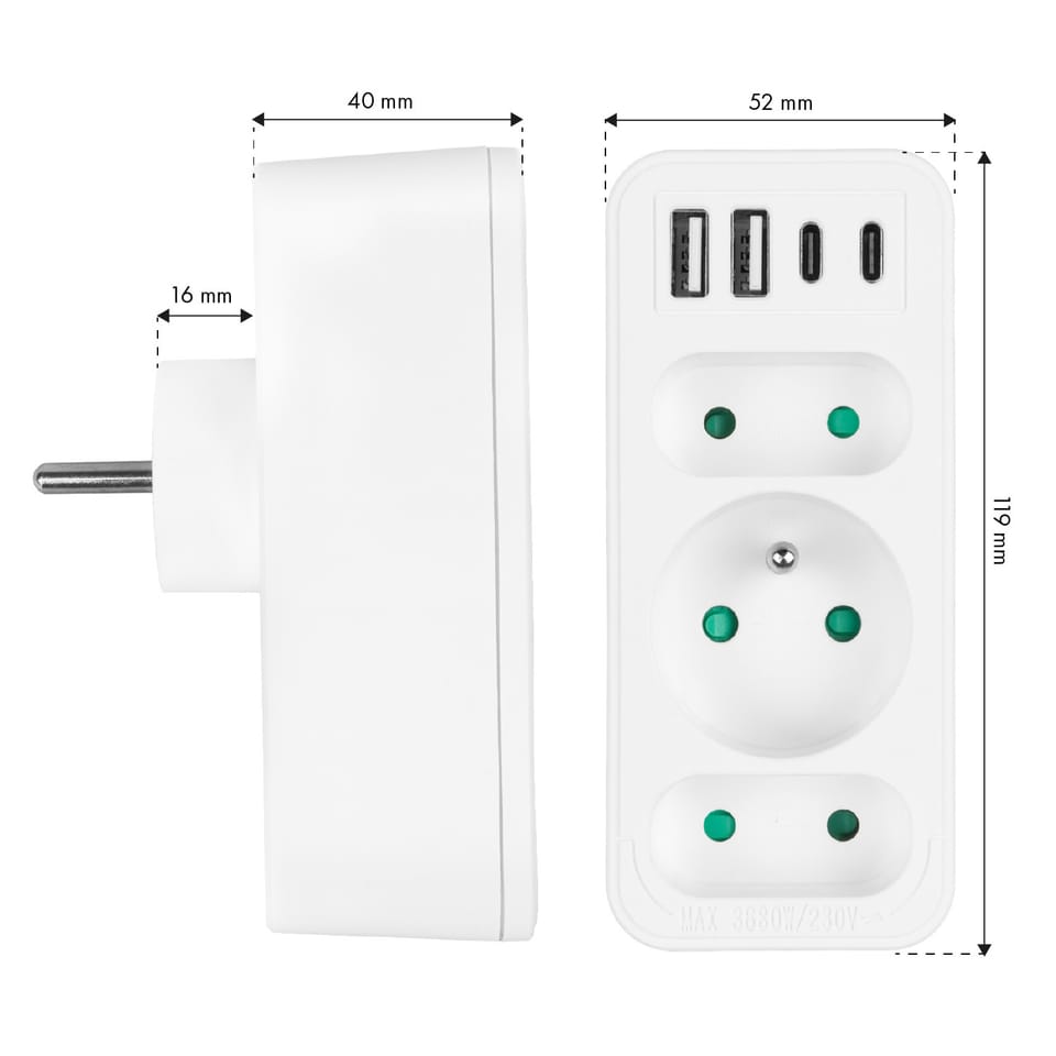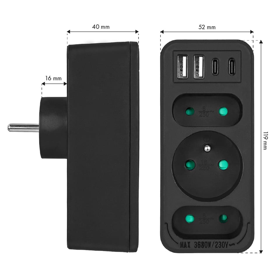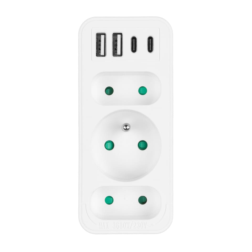 Gniazdko prądowe x3 + 4xUSB Maclean, rozgałęźnik z 3 gniazdami, 2xUSB A, 2xUSB C PD 20W, typu F, 1x16A + 2x6A, MCE248 F/W