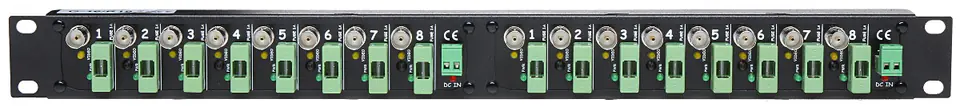 G-16/R19 jest urządzeniem przeznaczonym do wygodnego połączenia 2x8 przewodów telewizji przemysłowej typu YAP oraz uporządkowanym rozgałęzieniu zasilania z jednego zasilacza większej mocyGniazdo G-16/R19 rozgałęzia zasilanie do 2x8 wyjść, z których każde zabezpieczone jest bezpiecznikiem i posiada diodę LED informującą o jego przepaleniu (brak świecenia oznacza przepalenie bezpiecznika)G-16/R19 posiada trzy gniazda wejściowe zasilania, które są ze sobą połączoneNie ma znaczenia do którego złącza doprowadzimy zasilanie, co umożliwia połączenie albo za pomocą wtyku DC 2.1/5.5, albo odizolowanymi przewodamiPozwala to również łączyć szeregowo ze sobą łączówki np. zasilanie do gniazda DC IN, z zacisków kablowych DC IN, za pomocą przewodu WT-2.1 do drugiego gniazda G-16/R19Urządzenie idealnie nadaje się do połączenia zasilacza z wtykiem 2.1/5.5mm z przewodami YAP75 zasilającymi kamery