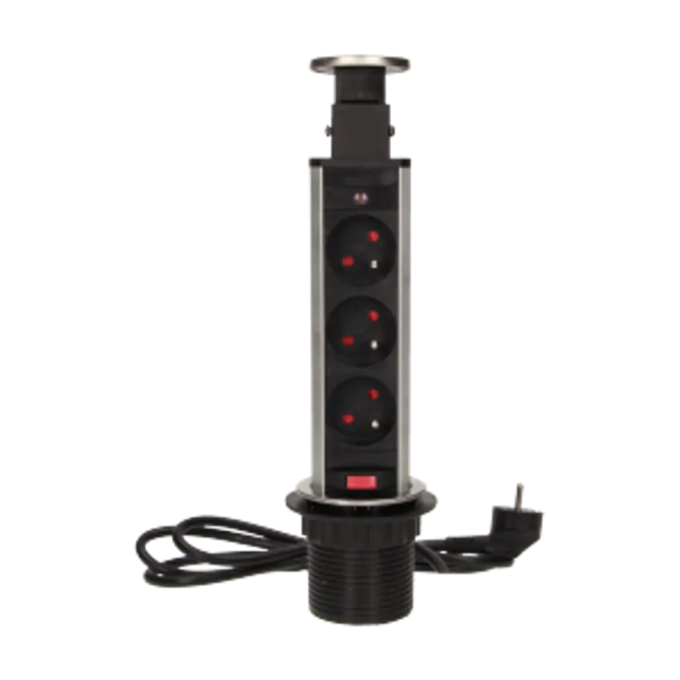Zestaw trzech gniazd sieciowych z uziemieniem i przesłonami torów prądowych w obudowie chowanej w blat. Urządzenie przeznaczone do montażu w stołach konferencyjnych, blatach mebli biurowych i kuchennych. Posiada wysuwany panel z gniazdami, dodatkową blokadę oraz przewód o długości 1,8 m. Stal nierdzewna INOX.