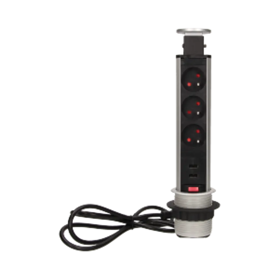 Zestaw trzech gniazd sieciowych z uziemieniem i przesłonami torów prądowych, połączonych z ładowarką USB w obudowie chowanej w blat. Urządzenie przeznaczone do montażu w stołach konferencyjnych, blatach mebli biurowych i kuchennych. Posiada wysuwany panel z gniazdami, dodatkową blokadę oraz przewód o długości 1,8 m. Tworzywo sztuczne + metal lakierowany srebrny.