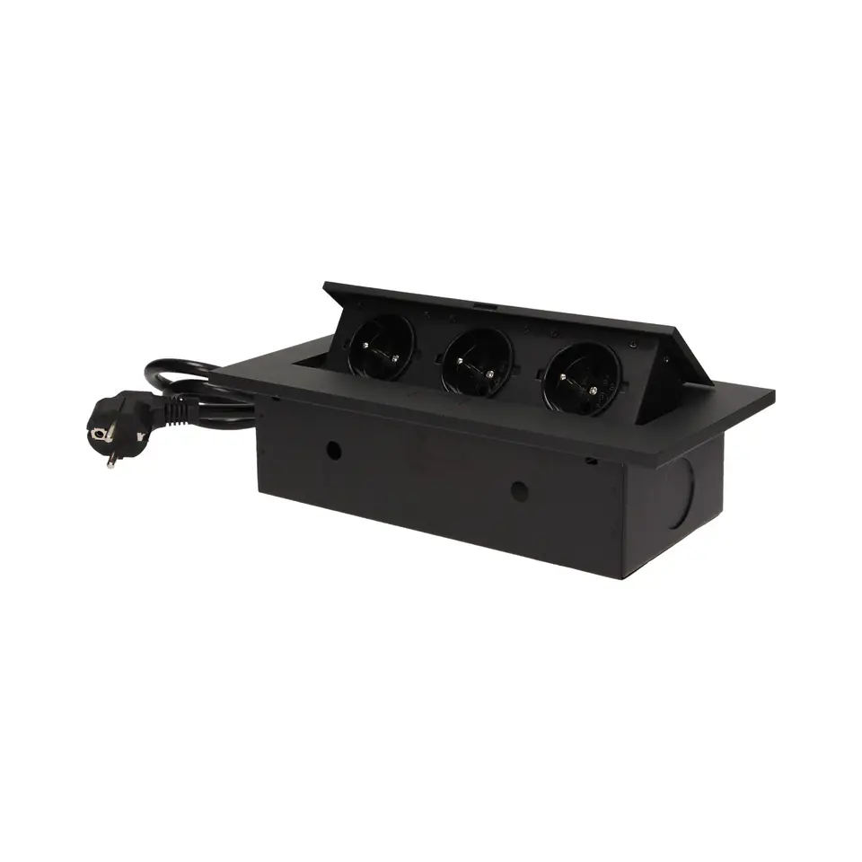 Zestaw trzech gniazd sieciowych z uziemieniem i przesłonami torów prądowych w obudowie chowanej w blat. Urządzenie przeznaczone jest do montażu w biurkach, blatach i stołach, może być zamontowane zarówno w pozycji pionowej jak i poziomej, zapewniając dostęp do gniazd elektrycznych. Posiada zamykany panel z gniazdami sieciowymi oraz przewód o długości 1,5m. Dostępne kolory: czarny, srebrny.