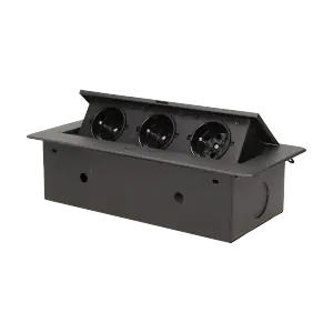 Zestaw trzech gniazd sieciowych z uziemieniem i przesłonami torów prądowych w obudowie chowanej w blat. Urządzenie przeznaczone jest do montażu w biurkach, blatach i stołach, może być zamontowane zarówno w pozycji pionowej jak i poziomej, zapewniając dostęp do gniazd elektrycznych. Zalecany przewód OWY 3 × 1,5 mm? (brak w zestawie). Dostępne kolory: czarny, srebrny, złoty, mosiądz, grafit.