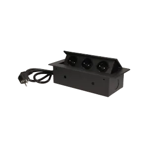 Zestaw trzech gniazd sieciowych z uziemieniem i przesłonami torów prądowych w obudowie chowanej w blat. Urządzenie przeznaczone jest do montażu w biurkach, blatach i stołach, może być zamontowane zarówno w pozycji pionowej jak i poziomej, zapewniając dostęp do gniazd elektrycznych. Posiada zamykany panel z gniazdami sieciowymi oraz przewód o długości 1,5 m. Dostępne kolory: czarny, srebrny, złoty, mosiądz, grafit.