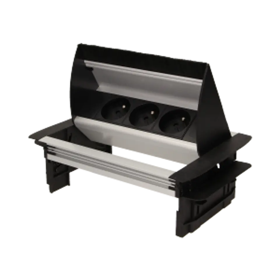 Zestaw trzech gniazd sieciowych z uziemieniem i przesłonami torów prądowych w obudowie chowanej w blat. Urządzenie przeznaczone do montażu w biurkach, blatach i stołach. Posiada zamykany panel z gniazdami, szczelinę wykończoną szczotką przeciwkurzową oraz przewód o długości 1,8 m.