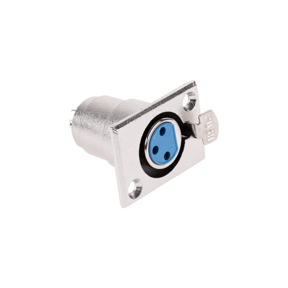 Gniazdo mikrofonowe typu XLR (canon) 3-pin źeńskie, chromowane, montażowe z zatrzaskiem uniemozliwiającym samoczynne wypadniecie wtyku