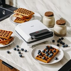 Gofrownica Nieprzywierająca powłoka płyt grzewczych Nienagrzewający się uchwyt 2 lampki kontrolne: zasilania i gotowości do pracy Stabilne, gumowe nóżki Rozmiar gofrów 2 x (8,5cm x 14,5cm) Wymiary urządzenia 27,5cm x 20,5cm x 10,0cm Długość przewodu zasilającego: 70 cm Kolor przewodu zasilającego: czarnyTyp wtyczki: E/F Kolor urządzenia: białyMoc Nom. 1200W Moc Maks. 1800W Zasilanie: 220-240V ~ 50/60 Hz