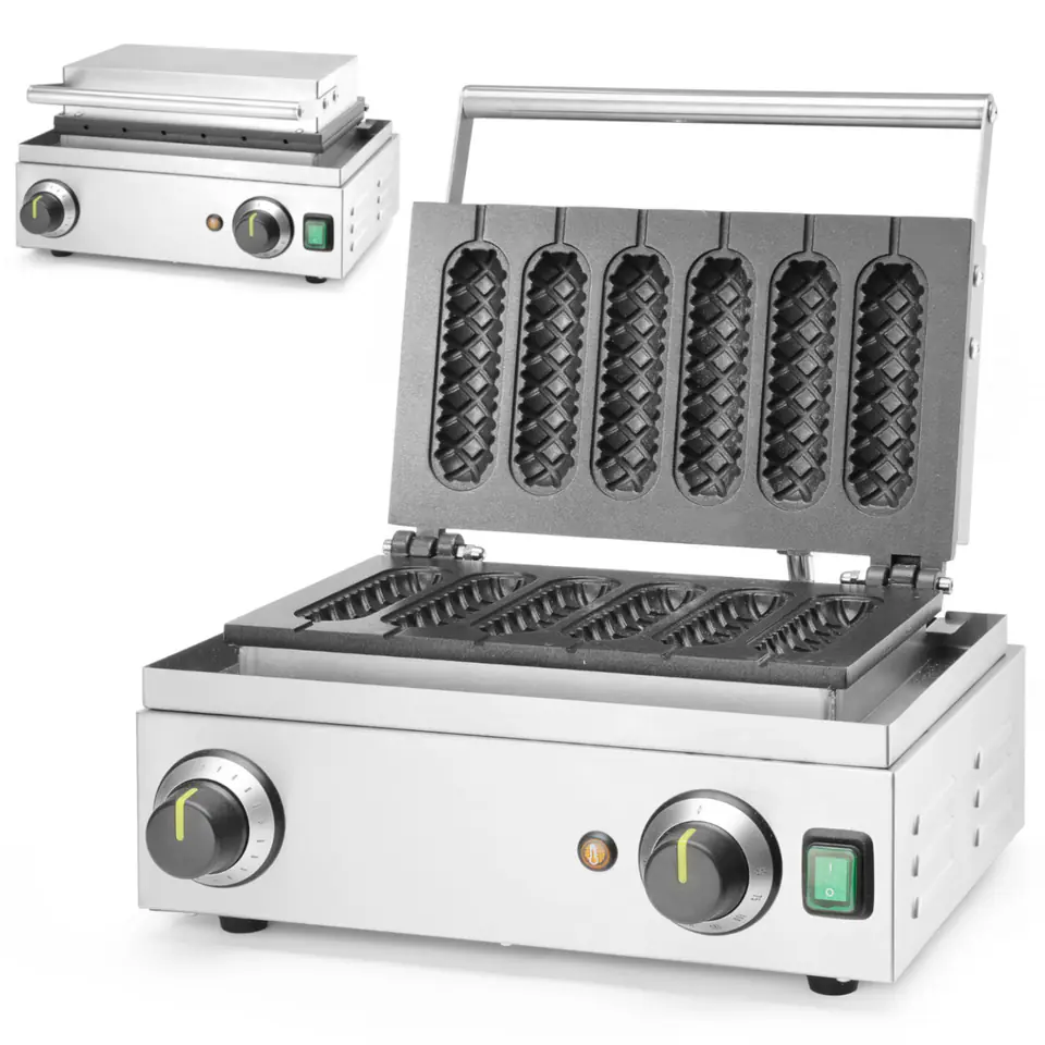 Kod producenta: 212189Gofrownica Corn-dog marki Hendi to idealna propozycja dla wszelkiego typu lokali gastronomicznych chcących poszerzyć swoją ofertę o atrakcyjne gofry na patyku. Obudowa wykonana została ze stali nierdzewnej 18/0, co gwarantuje długoletnie użytkowanie i łatwe czyszczenie. Otwory wentylacyjne w obudowie chronią elementy sterujące przed przegrzaniem. Rączka nie nagrzewa się. Płyta grzewcza wykonana została z odlewanego aluminium i pokryta trwałą powłoką z domieszką tytanu, co zapobiega przywieraniu. Możliwość pieczenia jednocześnie 6 gofrów lub corn-dogów. Płyta posiada specjalne żłobienia na patyczki. Rynienka ociekowa na nadmiar ciasta ułatwia utrzymanie czystości stanowiska pracy. Regulacja temperatury następuje bezstopniowo za pomocą termostatu w zakresie od 50˚C do 220˚C. Czasomierz ma zakres do 15 minCechy produktu: