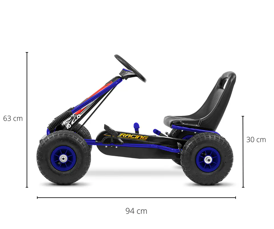 Duży, sportowy gokart na pedały został zaprojektowany dla najmłodszych kierowców i fanów szybkiej jazdy. Lekka metalowa konstrukcja wykończona plastikowymi obudowami utrzymana w sportowym stylu doda szyku kierowcy. Natomiast kubełkowy fotel z możliwością regulacji odległości od kierownicy – zapewnia komfort oraz pozwala na dopasowanie pojazdu do wzrostu kierowcy. Kompaktowa kierownica ułatwia sterowanie pojazdem, a duże pompowane opony zapewnią wygodę i komfort jazdy na każdej nawierzchni. Gokart posiada zabudowany łańcuchowy napęd na pedały z możliwością odłączenia napędu – funkcja „wolnego koła” oraz hamulec ręczny na tylną oś.