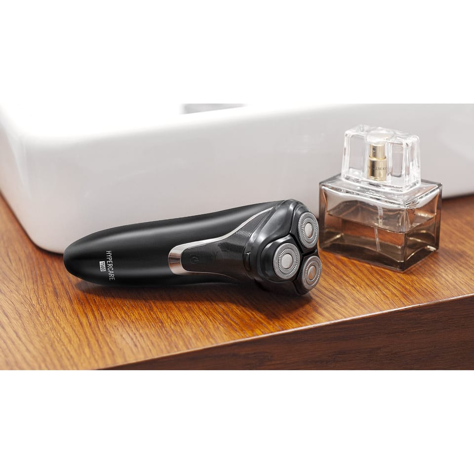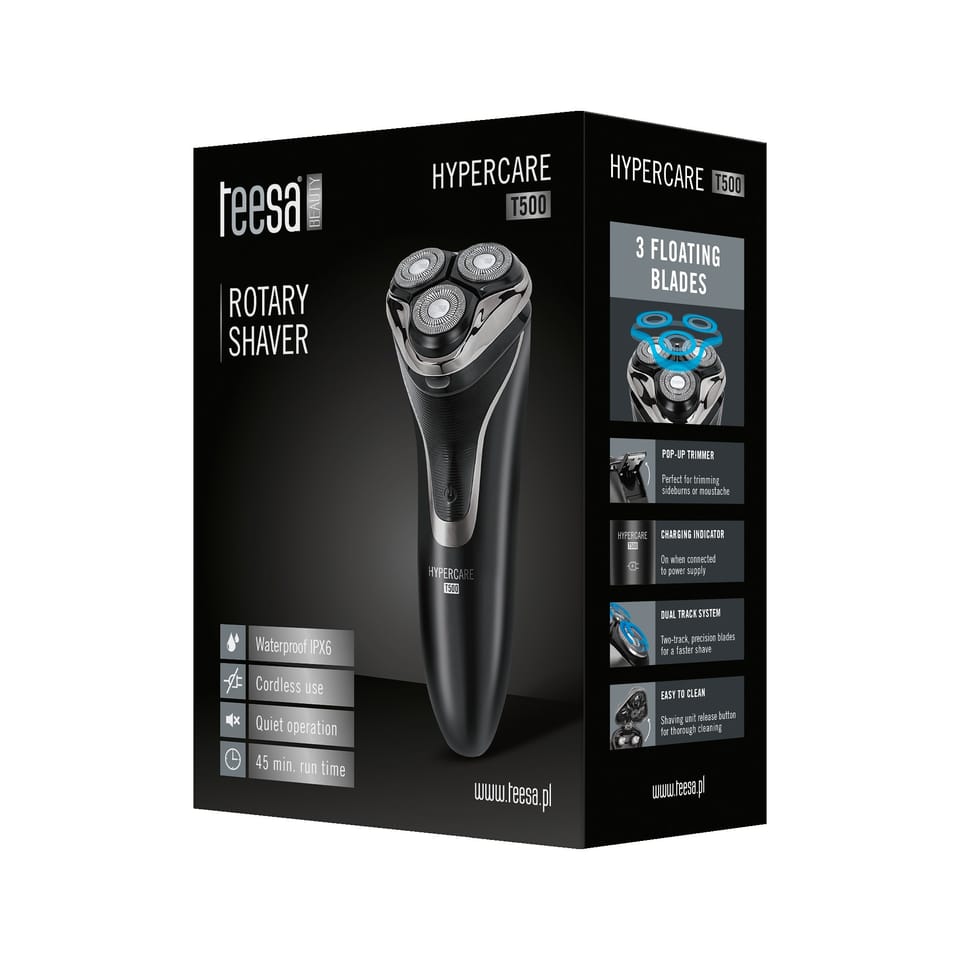 Golarka rotacyjna Hypercare T500 Masz dość niewygodnych jednorazówek, które podrażniają Twoją skórę? Zastąp je rotacyjną golarką Teesa HYPERCARE T500! Specjalna konstrukcja sprawia, że idealnie dostosowuje się ona do kształtu twarzy, zapewniając niezwykle szybkie i precyzyjne golenie. Wytrzymałe ostrza Rotacyjna golarka HYPERCARE T300 została wyposażona w trzy elastyczne ostrza ze stali nierdzewnej. Ich specjalna konstrukcja oraz dochodząca do 7200 obrotów na minutę prędkość sprawiają, że urządzenie bez problemu poradzi sobie z każdym zarostem. System podwójnych ostrzy Potrzebujesz urządzenia, które sprosta każdemu zadaniu? Właśnie taka jest golarka rotacyjna Teesa HYPERCARE T500. Podwójne ostrza tnące idealnie dopasowują się do kształtu twarzy, bez problemu radząc sobie z najtwardszym zarostem. Wysuwany trymer Golarka rotacyjna Teesa HYPERCARE T500 z pewnością przypadnie do gustu fanom bardziej wyszukanego wyglądu. Urządzenie posiada wysuwany trymer, który umożliwi jeszcze dokładniejsze wystylizowanie brody i wąsów czy przycięcie bokobrodów. Wbudowany akumulator Zależy Ci na maksymalnym komforcie podczas golenia? Golarka HYPERCARE T500 została wyposażona we wbudowany akumulator zapewniający do 45 minut pracy bez potrzeby ładowania. Dodatkową zaletą urządzenia jest także wskaźnik informujący o poziomie naładowania baterii. Łatwość czyszczenia Golarka rotacyjna Teesa HYPERCARE T500 to nie tylko łatwość golenia, ale także łatwość czyszczenia! Wystarczy nacisnąć przycisk zwalniający głowicę z ostrzami, aby ją otworzyć, a następnie wyczyścić za pomocą dołączonej do zestawu szczoteczki.