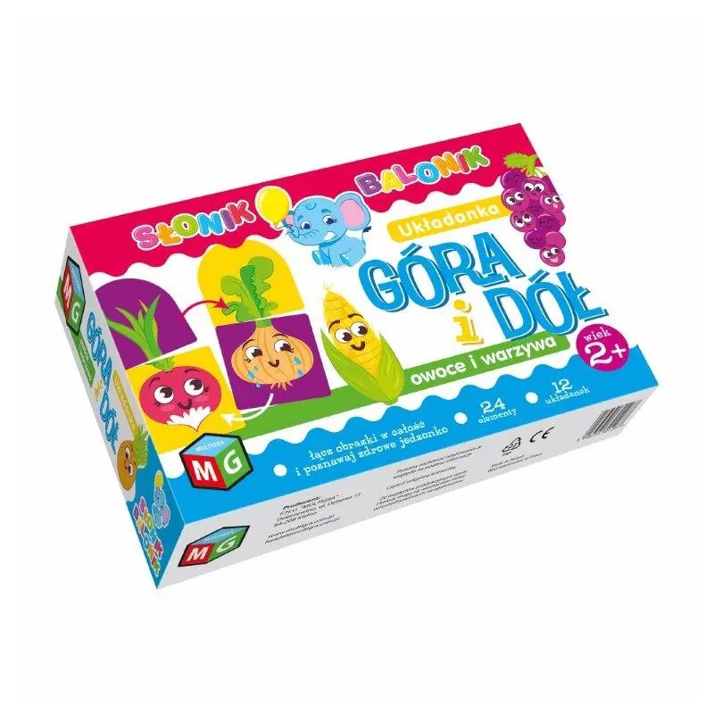 "UKŁADANKA GÓRA I DÓŁ: OWOCE I WARZYWA" to przyjemna zabawa dla maluchów i ich rodziców. Układaj uśmiechnięte warzywa, pamiętaj tylko, żeby się nie pomylić! Dopasuj górę marchewki do jej dołu. Ojej! A płacząca cebula? Przecież powinna mieć na głowie szczypiorek, a nie natkę! Zestaw zawiera: elementy układanki - 24szt oraz instrukcję. Wymiary pudełka w cm: 29 / 19 / 5