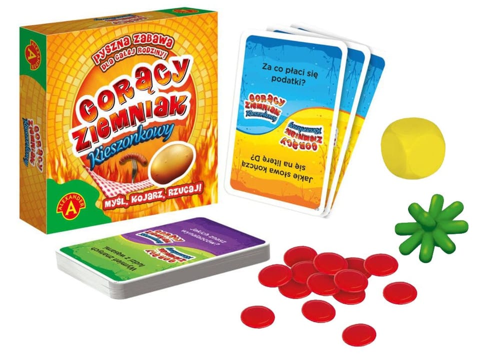 Wielki hit sprzedażowy, który teraz zmieści się nawet do Twojej kieszeni! To przezabawna gra rodzinna sprawdzająca refleks. Zakręć bączkiem lub ustaw czas w aplikacji, odkryj pytanie i odpowiadaj czym prędzej! Każda osoba, która udzieli poprawnej odpowiedzi, przerzuca gorącego ziemniaka do najbliższego sąsiada. Ten, kto nie zdąży odpowiedzieć, zanim czas się skończy, zostaje ze spalonym ziemniakiem i na planszy spada coraz bliżej grilla. W tej zabawie wygrywa gracz, który wykonał najmniej ruchów własnym pionkiem. Prosta, ale niezwykle wciągająca rozgrywka przypadnie do gustu każdemu, niezależnie od wieku.Karty do gry - 27 szt., Pchełki - 25 szt., Mały bączek, Kostka (ziemniak), Instrukcja