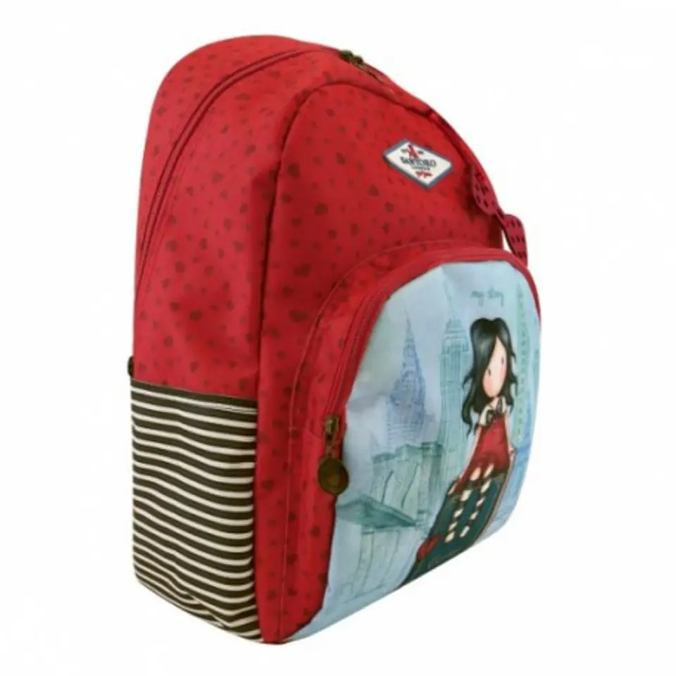 Gorjuss - Plecak - My Story Wyjątkowo praktyczny i piękny plecak z wizerunkiem dziewczynki Gorjuss w odcieniach czerwieni rubinowej i głębokiego turkusu. Ma miękkie i wygodne uchwyty do założenia na plecy z regulacją długości. Kieszenie zamykane na suwaki ozdobione medalionami w stylu antycznego mosiądzu z główką dziewczynki Gorjuss. Przestronne wnętrze ozdobione stylowymi paskami. Lekki i funkcjonalny podzielony na dwie kieszenie. Pierwsza, obszerna przeznaczona na większe elementy. Druga, płaska na drobiazgi. Rozmiar: 45cm. x 33cm. x 12cm.