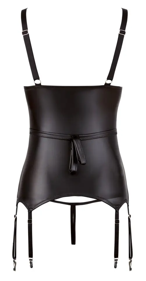 Gorset z odkrytymi piersiami wykonany z matowej tkaniny. Ozdobiony metalowymi detalami. Z tyłu kajdanki. Ramiączka i 6 pasków do pończoch są regulowane. W komplecie stringi. Materiał: 90% poliester, 10% elastan. W komplecie nie ma pończoch.