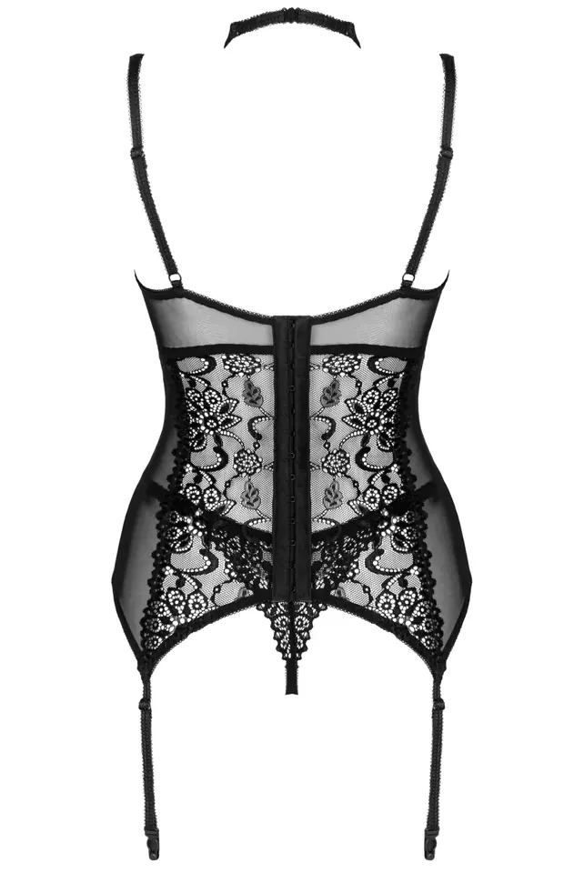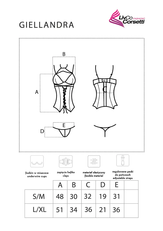 Gorset Giellandra for the senses to zestaw luksusowej polskiej marki LivCo Corsetti Fashion, składający się z 2 elementów - gorsetu i stringów. Bielizna jest w klasycznym, czarnym kolorze. Gorset jest zapinany na haftki, co umożliwia regulację, a przy tym gwarantuje wygodę. Istnieje także możliwość regulowania długości ramiączek i przypięcia pończoch, które świetnie urozmaicą stylizację. Jest to doskonała propozycja dla kobiet, które cenią sobie wygodę, ale nie chcą rezygnować ze zmysłowego wyglądu. Bielizna została wykonana z 90% poliamidu i 10% elastanu. Takie połączenie materiałów sprawia, że strój jest bardzo elastyczny i nie krępuje ruchów. Komplet zawiera dekoracyjne wstawki z wytrzymałej koronki, która podkreśla kobiece kształty we wszystkich najważniejszych miejscach. Krój i wiązanie na brzuchu sprawia, że gorset jest wyrafinowany, a jednocześnie zostawia przestrzeń dla wyobraźni. Nietypowym elementem jest choker, który zwróci uwagę na szyję i obojczyki. Ten seksowny gorset z pewnością urozmaici wiele romantycznych wieczorów.