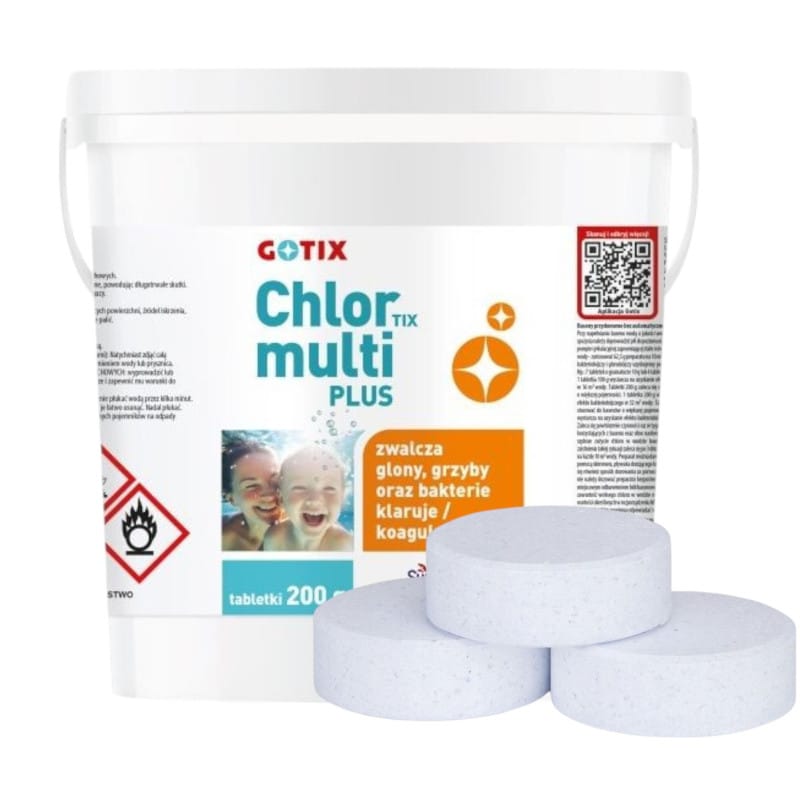Produktów biobójczych należy używać z zachowaniem środków ostrożności.Przed każdym użyciem należy przeczytać etykietę i informacje dotyczące produktu. CHEMIA BASENOWA GOTIXCHLOR DO BASENUTABLETKI MULTIFUNKCYJNE 200g 10w1 opakowanie 5 kg PRODUKT POLSKI ChlorTix Mutli to bardzo wydajny, skuteczny i profesjonalny preparat bakteriobójczy i grzybobójczy do dezynfekcji wody basenowej, stosowany przez profesjonalistów w największych Aquaparkach w Polsce i Europie.Produkty firmy Gotix, z 30-letnim doświadczeniem na rynku, są renomowane ze względu na swoją wysoką jakość.Produkt przeszedł rygorystyczne badania laboratoryjne, potwierdzające jego skuteczność w działaniu. Jest dostępny w formie tabletek 200g.Tabletki CHLORTIX MULTI 200g są dedykowane dla większych basenów ogrodowych - stelażowych i rozporowych. 1 tabletka 200 g wystarcza na uzyskanie efektu bakteriobójczego w 30,6 m3 wody.Nasz produkt posiada stwierdzone działanie bakteriobójcze i grzybobójcze. TABLETKI 10w1 1. ODKAMIENIANIE2. GLONASTYTYCZNE DZIAŁANIE3. DEZYNFEKCJA4. DZIAŁANIE BAKTERIOSTATYCZNE5. KLAROWANIE WODY6. FLOKULACJA7. STABILIZACJA WOLNEGO CHLORU8. NABŁYSZCZANIE9. DZIAŁANIE BAKTERIOBÓJCZE10. STABILIZACJA pH• Dezynfekcja - niszczy bakterie i grzyby.• Każda tabletka zapakowana w osobny blister• Stabilizacja pH - utrzymuje optymalne pH wody.• Koagulacja - ułatwia usuwanie zanieczyszczeń przez filtr.• Flockowanie - zbiera drobne cząsteczki, ułatwiając ich usunięcie.• Usuwanie metali ciężkich - neutralizuje żelazo i mangan.• Dobra kompatybilność - można stosować z innymi środkami.• Wysoka rozpuszczalność - całkowicie rozpuszcza się w wodzie. • Redukcja osadów i zamglenia wody - utrzymuje wodę klarowną.• Wydłużenie żywotności urządzeń - chroni filtry i pompy.• Skuteczność w różnych temperaturach - działa efektywnie w szerokim zakresie temperatur.• Łatwość dozowania - precyzyjna kontrola jakości wody.• Bezpieczne dla kąpiących - gwarantuje bezpieczeństwo przy prawidłowym stosowaniu.• Elastyczność w zastosowaniach - stosowany w basenach prywatnych i publicznych.• Ogranicza konieczność stosowania dodatkowych środków.• Sprawdzony i niezawodny - stosowany przez profesjonalistów.• Optymalizacja kosztów - obniża koszty eksploatacji basenu.• Lepsza jakość wody - utrzymuje czystość wody.• Stabilność - stabilny w przechowywaniu.Sposób użycia:• Preparat Chlortix Multi 200g można dawkować bezpośrednio za pomocą skimera lub pływaka dozującego. Zaleca się również sposób dozowania za pomocą śluzy dozującej. Nigdy nie należy dozować preparatu bezpośrednio do basenu, gdyż grozi to miejscowym odbarwieniem folii basenowej.Niszczy patogeny takie jak Escherichia coliPseudomonas aeruginosaStaphylococcus aureusEnterococcus hiraeLegionella pneumophilaCandida albicansAspergillus NigerDokładne dawki i czasy potrzebne do uzyskania efektu biobójczego dla powyższych szczepów podane są na etykiecie produktu.Dozowanie:Dla utrzymania odpowiedniego poziomu chloru, zaleca się stosowanie do większych basenów 1 tabletka Chlortix Multi 200g wystarcza na 32 m3 wody co 7 dni. W razie potrzeby, dawkowanie można dostosować w zależności od intensywności korzystania z basenu oraz innych czynników wpływających na jakość wody.Wartość pH powinna być utrzymywana w przedziale 6,9-7,2. Można korzystać z basenu, gdy po procesie dezynfekcji stężenie wolnego chloru będzie zgodne z wartościami określonymi w rozporządzeniu Ministra Zdrowia w sprawie wymagań jakim powinna odpowiadać woda na pływalniach. BEZPIECZEŃSTWO Produktów biobójczych należy używać z zachowaniem środków ostrożności. Przed każdym użyciem należy przeczytać etykietę i informacje dotyczące produktu.Należy unikać: wdychania, kontaktu ze skórą, oczami oraz spożywania. W wypadku narażenia postępować zgodnie z instrukcją na etykiecie produktu.Niebezpieczny dla środowiska w szczególności organizmów wodnych.Produkt należy przechowywać w oryginalnym opakowaniu, w chłodnych i przewiewnych pomieszczeniach z dala od substancji utleniających, kwasów i substancji łatwopalnych. Opakowanie powinno być wyraźnie oznakowane. Chronić przed wilgocią i kontaktem z innymi substancjami.Temperatura składowania 5 - 25°C. SKŁAD Substancja czynna: symklosen CAS: 87-90-1, WE: 220-767-7 [inna nazwa: kwas trichloroizocyjanurowy] zaw. 970 mg/g (zaw. aktywnego chloru min 800mg/g).Inne składniki: siarczan miedzi, siarczan glinu, kwas borowy.