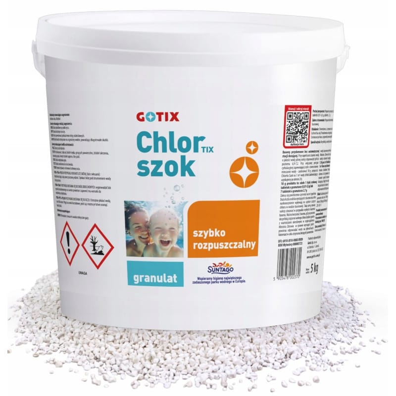 Produktów biobójczych należy używać z zachowaniem środków ostrożności. Przed każdym użyciem należy przeczytać etykietę i informacje dotyczące produktu.CHEMIA BASENOWA - GOTIXCHLOR SZOK W GRANULACIEOPAKOWANIE 5 kg!!! NIEBIESKA WODA !!!!!! PRODUKT POLSKI !!!Szybko i skutecznie eliminuj bakterie i zanieczyszczenia w basenie. Chlortix Szok to idealne rozwiązanie do natychmiastowej dezynfekcji wody!Szybko działający granulat chlorowy do basenów. Dezynfekuje wodę usuwa bakterie i zanieczyszczenia. Ekspresowe działanie – natychmiast rozpuszcza się w wodzie, eliminując zanieczyszczenia Silna dezynfekcja Krystalicznie czysta woda – poprawia jakość i przejrzystość wody w basenie Łatwa aplikacja – wygodna forma granulatu do szybkiego użycia Do wszystkich basenów – idealny do basenów prywatnych i publicznychOdpowiednią dawkę preparatu należy rozpuścić w wodzie i wlać bezpośrednio do basenu. Przestrzegamy przed wsypaniem granulatu do basenu - może to odbarwić wykładzinę w basenie.Chlorowanie szokowe można wykonywać regularnie nawet jeśli z wodą nie ma większych problemów. Będzie miało to wtedy charakter zapobiegawczy. Podniesienie dawki chloru raz na 2 tygodnie znacznie poprawi właściwości wody w basenie. Dezynfekcję należy przeprowadzać wieczorem.Wszelkie informacje oraz szczegółowy sposób użycia i dozowanie znajdziesz na opakowaniu.Jak stosować1 Sprawdź poziom pH – powinien wynosić 6,9-7,22 Odmierz odpowiednią dawkę – 18 g na 1m3 wody3 Wsyp do wody lub skimmera4 Odczekaj 30 minut przed kąpielą5 Regularnie kontroluj poziom chloru i pHNiszczy patogeny takie jak:Escherichia coliPseudomonas aeruginosaStaphylococcus aureusEnterococcus hiraeLegionella pneumophilaDokładne dawki i czasy potrzebne do uzyskania efektu biobójczego dla powyższych szczepów podane są na etykiecie produktu. ZALETY STOSOWANIA GRANULATU • Szybkie działanie - działa ekspresowo, eliminując wszelkie drobnoustroje i zanieczyszczenia w krótkim czasie.• Skuteczna dezynfekcja.• Poprawa jakości wody – przyczynia się do usunięcia mętności wody oraz zapobiega powstawaniu osadów i nalotów.• Nadaje się do stosowania w basenach z różnymi rodzajami filtrów - jest kompatybilny z basenami wyposażonymi w filtry piaskowe, wkłady filtracyjne, filtry diatomowe oraz filtry ze szkłem filtracyjnym.• Zastosowanie w sytuacjach awaryjnych - ChlorTix Szok jest idealny do stosowania po dużym obciążeniu basenu lub w sytuacjach, gdy woda wymaga natychmiastowego oczyszczenia.• Wzmacnia działanie innych preparatów - może być stosowany razem z innymi produktami do pielęgnacji wody basenowej, potęgując ich efekty.• ChlorTix Szok to doskonałe rozwiązanie dla osób poszukujących szybkiego i skutecznego sposobu na dezynfekcję wody basenowej. ZASTOSOWANIE baseny przydomowe bez automatycznej stacji dozującej,baseny z automatyczną stacją dozującą