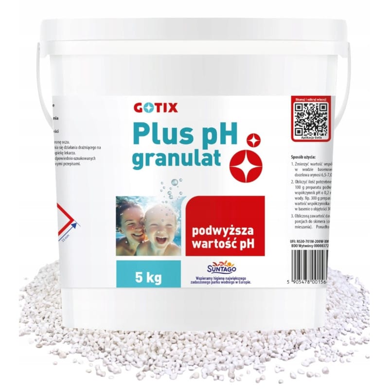 Produktów biobójczych należy używać z zachowaniem środków ostrożności.Przed każdym użyciem należy przeczytać etykietę i informacje dotyczące produktu.CHEMIA BASENOWA GOTIXPlus PH Granulat - 5kg!!! PRODUKT POLSKI !!!pH Plus Granulat – podwyższanie poziomu pH wody w basenieNOWE ETYKIETKILEPSZA FORMUŁANAJLEPSZY PREPARAT NA RYNKU• Preparat służący do podwyższania poziomu pH wody w basenie• Wydajny i o wysokim stężeniu substancji czynnej• Przeznaczony do użytku powszechnego• Przystosowany do basenów stelażowych, rozporowych• Prawidłowy poziom pH w basenie powinien oscylować pomiędzy 6,8, a 7,2• Przy korekcie pH przydatny jest także Minus pH granulat do basenu1Jak stosować• Zmierzyć wartość współczynnika pH w wodzie basenowej. Wartość docelowa wynosi 6,8, a 7,2.• Obliczyć wartość potrzebnego preparatu. 100g preparatu podwyższa średnio współczynnik pH o 0,2 na każde 10m3 wody. Np. 300g preparatu podwyższy wartość współczynnika pH z 6,8 do 7,0 w basenie o objętości 30m3.• Obliczoną zawartość dawkować w kilku porcjach do skimmera (celem szybszego mieszania). Ponadto dawkowanie podzielone na kilka razy pozwala uniknąć przedawkowania.• Przy dawkowaniu za pomocą pomp automatycznych zaleca się stosowanie 20% roztworu.