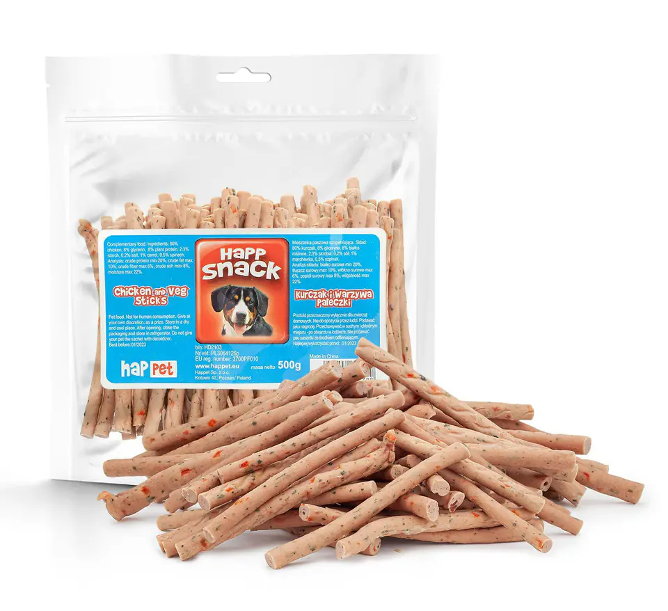 Pełnowartościowa przekąska dla psów. Mięso z kurczaka obfituje w łatwo przyswajalne, pełnowartościowe białko, a także magnez, potas i witaminy z grupy B, konieczne do prawidłowej pracy układu nerwowego. Dodatek warzyw wzbogaca przysmak o witaminy C, prowitaminę A, naturalne antyoksydanty oraz nieodzewny dla prawidłowej pracy jelit błonnik. Niska zawartość tłuszczu czyni pałeczki świetnym urozmaiceniem diety zwierząt otyłych, a także z przyczyn zdrowotnych (zapalenie trzustki, przewlekła niewydolność wątroby itp.) nie tolerujących większych ilości lipidów w pożywieniu. Produkt jest wolny od sztucznych konserwantów, barwników oraz innych syntetycznych modyfikatorów smaku i zapachu.