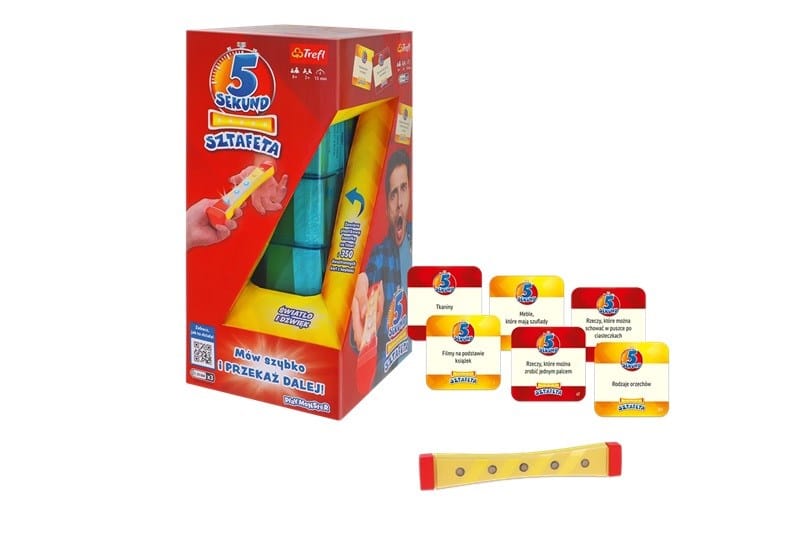 5 sekund SZTAFETA to jeszcze bardziej spontaniczna i nieprzewidywalna odsłona kultowej gry, w której szybko myślisz i szybko mówisz. Przeczytaj na głos hasło z karty, wykrzycz odpowiedzi i podaj pałeczkę wybranemu przez siebie graczowi.