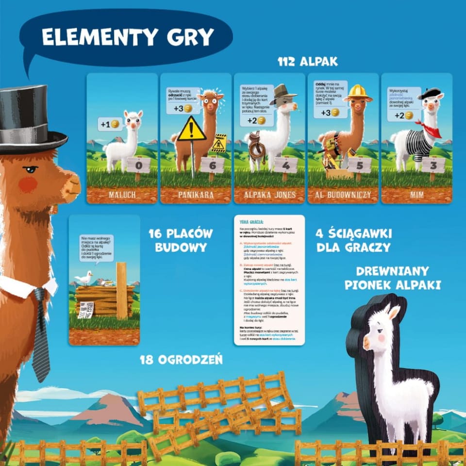 Gra pełna puszystych alpak!Gracze tworzą łąki pełne alpak. Na łące każda z nich musi być inna! Alpaki mają różne zdolności i dają różną liczbę punktów. Wygra osoba, która zdobędzie najwięcej punktów za alpaki na swojej łące.
