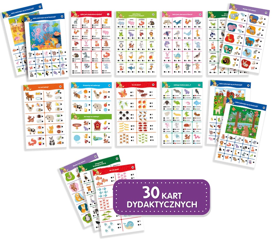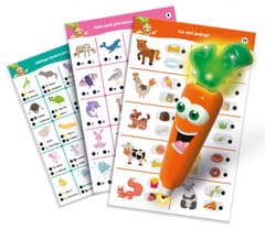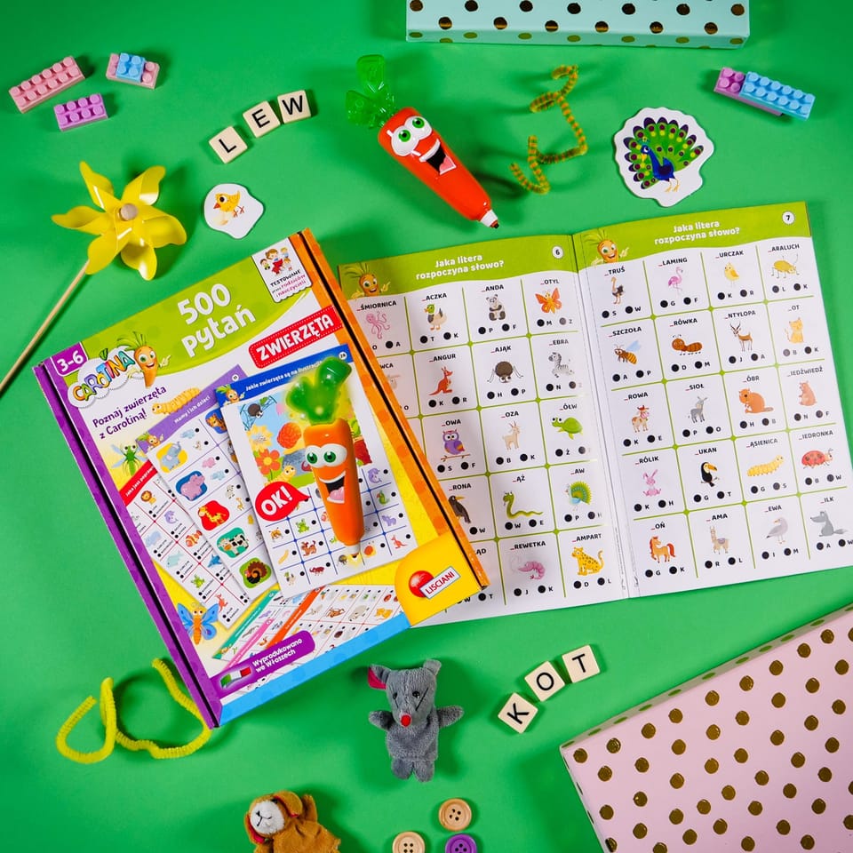 500 pytań Carotiny pomoże dziecku poznać wiele zwierząt dzięki 30 interaktywnym kartom edukacyjnym. Wystarczy użyć mówiącej i świecącej Carotiny, aby odpowiedzieć na pytania, naciskając końcówką długopisu czarne kropki przypisane do odpowiedzi. Dziecko może także zagrać w Szukaj i znajdź, wyszukując zwierzęta na ilustracjach Miłej zabawy!
