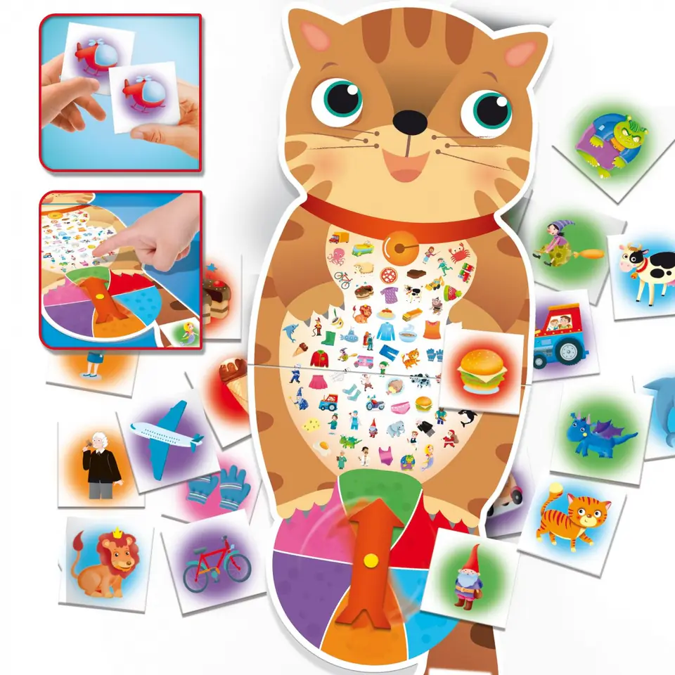 Opakowanie zawiera 144 karty, spinner oraz planszę w kształcie kota. Akcesoria umożliwiają dzieciom rozgrywkę w dwie gry - klasyczną grę pamięciową, w której rozpoznawane są pary takich samych obrazków i obserwacyjną, do której używany jest spinner.