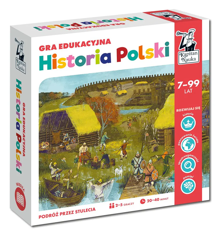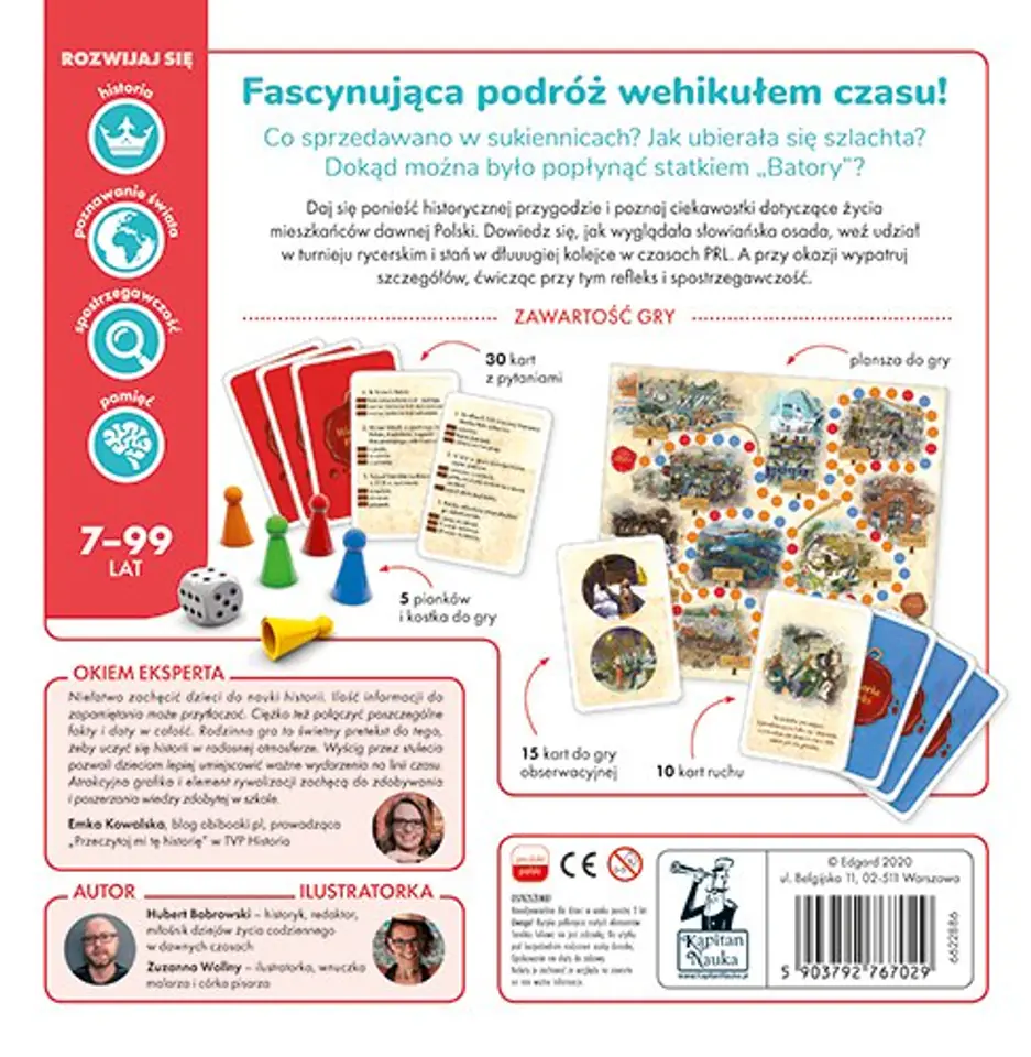 | Fascynująca podróż przez stulecia Gra edukacyjna „Historia Polski" (7-99 lat) to wspaniała przygoda dla miłośników podróży w czasie oraz ciekawostek historycznych. Gracze ścigają się o zwycięstwo i poznają przy tym życie mieszkańców dawnej Polski. Dodatkowe zadania z wyszukiwaniem obrazków z kart na planszy urozmaicają rozgrywkę, a przy tym ćwiczą spostrzegawczość oraz refleks. Co sprzedawano w sukiennicach? Jak ubierała się szlachta? Dokąd można było popłynąć statkiem „Batory"? - odpowiedzi na te i wiele innych pytań można poznać w czasie emocjonującej zabawy. Nauka historii przez zabawę Niełatwo zachęcić dzieci do nauki historii. Ilość informacji do zapamiętania może przytłaczać. Ciężko też połączyć poszczególne fakty i daty w całość. Rodzinna gra to świetny pretekst do tego, żeby uczyć się historii w radosnej atmosferze. Wyścig przez stulecia pozwoli dzieciom lepiej umiejscowić ważne wydarzenia na linii czasu. Atrakcyjna grafika i element rywalizacji zachęcą do zdobywania i poszerzania wiedzy zdobytej w szkole. Emka Kowalska, blog obibooki.pl, prowadząca „Przeczytaj mi te historię" w TVP Historia Gra „Historia Polski" pokazuje, że historii można uczyć się w ciekawy i nowoczesny sposób. W czasie wyścigu po planszy gracze odpowiadają na pytania związane z dziejami Polski i jej dawnych mieszkańców, wykonują zadania opisane na kartach ruchu oraz wypatrują na planszy osoby i obiekty przedstawione na kartach do gry obserwacyjnej. Historyczna wyprawa rozbudza ciekawość świata, uczy myślenia logicznego, pozwala poznać różne okresy historyczne oraz dostrzec ich niepowtarzalność. Zamiast wkuwania dat gracze poznają szeroki kontekst kulturowy i społeczny. Barwne ilustracje Zuzanny Wollny, specjalizującej się w historycznych narracjach dla dzieci, przyciągają uwagę atrakcyjnością szczegółów oraz zachęcają do poznawania historii Polski. Plansza została wykonana z grubej tektury, co gwarantuje bezpieczną zabawę oraz wytrzymałość nawet podczas najbardziej emocjonujących rozgrywek. Rozwój historia, poznawanie świata, spostrzegawczość, pamięć |