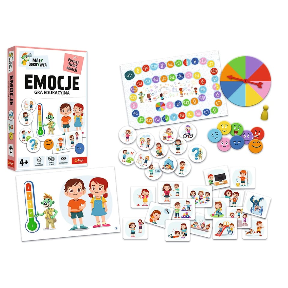 Emocje to gra edukacyjna, dzięki której dzieci zapoznają się ze światem własnych uczuć. Podczas zabawy poznają nie tylko nazwy emocji, ale także uczą się rozpoznawać odczucia własne i drugiej osoby , określają ich natężenie , szukają sposobów radzenia sobie z trudnymi sytuacjami. Kolorowe ilustracje stanowią dobry wstęp do rozmowy o świecie dziecięcych emocji. Gra rozwija u malucha kompetencje emocjonalno-społeczne, co stanowi jeden z fundamentów dalszego prawidłowego rozwoju.