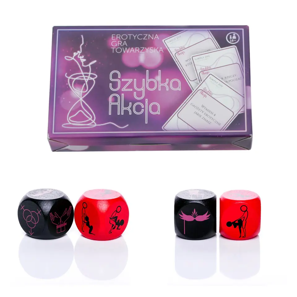 Zestaw składający się z gry karcianej Szybka Akcja i 2 szt. kostek Fetyszysta.SZYBKA AKCJA - EROTYCZNA GRA TOWARZYSKAOśmielisz się na głos wyznać swoje grzechy i fantazje erotyczne? A może wolisz je przemilczeć? Na odpowiedź masz TYLKO 7 sekund. Podejmij decyzję i przyjmij wyzwanie. Otwórz się na nowe doświadczenia a czeka Cię wspaniała podróż z Twoją osobą partnerską i przyjaciółmi.Zasady są proste: Ułóż karty w stos. Osoba po Twojej prawej stronie ciągnie pierwszą z brzegu i po przeczytaniu pytania szybko ustawia dołączoną klepsydrę. Pamiętaj! Twój czas na odpowiedź jest ograniczony! Musisz wymienić 4 rzeczy przed upływem czasu! Jak Ci się uda a pozostali gracze zaakceptują Twoją odpowiedź, zdobywasz punkt! Jeżeli nie, możecie urozmaicić zabawę, ponieść się fantazji i wymyślić karę :)Zawartość pudełka:-110 kart z pytaniami-specjalny czasomierz-pudełko na kartyCechy gry:liczba graczy: 2+wiek: 18+Uwaga! Gra tylko dla osób pełnoletnich.Zestaw „Fetyszysta”Zestaw kostek do gry erotycznej, dla nieco wybrednych graczy, którzy lubią przeskakiwać standardy i są otwarci na nowe propozycje... Przekonajcie się sami, czy potrzebne Wam hasło bezpieczeństwa czy zagracie Va Bangue.To świetny dodatek do:WIECZORU PANIEŃSKIEGOWIECZORU KAWALERSKIEGO18-STKIROCZNICYURODZINIMIENINODJECHANEJ IMPREZY