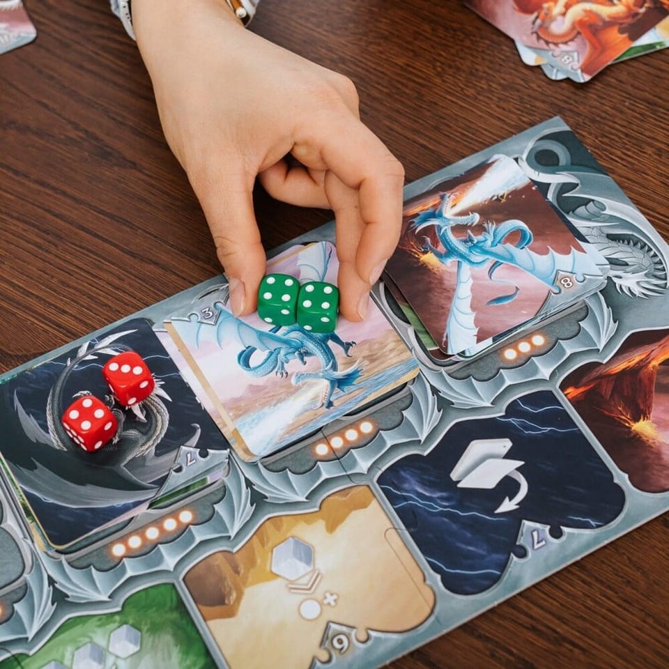 Trefl, Księga Smoków, Rodzinna gra planszowa dla Dzieci od 8. roku życia Księga Smoków to gra towarzyska ilustrowana pięknymi, ręcznie rysowanymi grafikami smoków. Wkrocz do świata składającego się tajemniczych krain, zamieszkałych przez najróżniejsze gatunki smoków. Odkrywaj i dopisuj je do magicznej Księgi, aby inni badacze mogli korzystać z dokonanych przez Ciebie odkryć. Podczas rozgrywki zdobywaj leżące na planszy karty smoków i zbieraj punkty. Smoki posiadają specjalne zdolności, których użycie pomoże Ci wyprzedzić współgraczy. Zdobądź najwięcej punktów i zostań najlepszym badaczem smoczych krain! W grze Kraina Smoków zastosowano unikalną mechanikę wykorzystującą kości, dzięki czemu rozgrywka zachwyci nawet wymagających graczy. Gra rozwija strategiczne myślenie oraz pozwala ćwiczyć podstawowe zdolności matematyczne. Przeznaczona jest dla 2-5 graczy wieku od 8 lat, a średni czas rozgrywki wynosi 25 minut. Cechy gry: • Gra rodzinna, towarzyska • Piękne, ręcznie rysowane grafiki smoków • mechanika wykorzystująca kości • Idealna dla dzieci od 8. roku życia Gra rozwija: • Umiejętność logicznego myślenia • Zdolność zdrowej rywalizacji Poznaj Gry Trefl z Bobaskami i Misiem i podziel się radością z rozgrywki. Gry dla najmłodszych to doskonały prezent z okazji urodzin, Dnia Dziecka lub pod choinkę. Świetnie sprawdzą się podczas chwil spędzanych w gronie rodzinnym. Zawartość pudełka: • 35 kart smoków • 6 kart celów • plansza puzzlowa (3 elementy) • 5 żetonów immunitetu (w tym żeton pierwszeństwa) • 15 kości wyprawy w 5 kolorach • instrukcja Wymiary pudełka: 200x200x53 Ilość Graczy: 2-5 Średni czas rozgrywki: 25 min Wiek: 8+