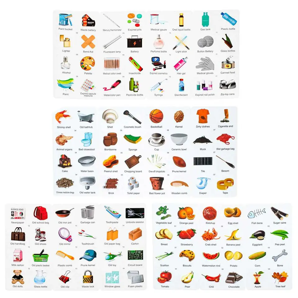 Na każdej karcie znajduje się obrazek z podpisem w języku angielskim.
