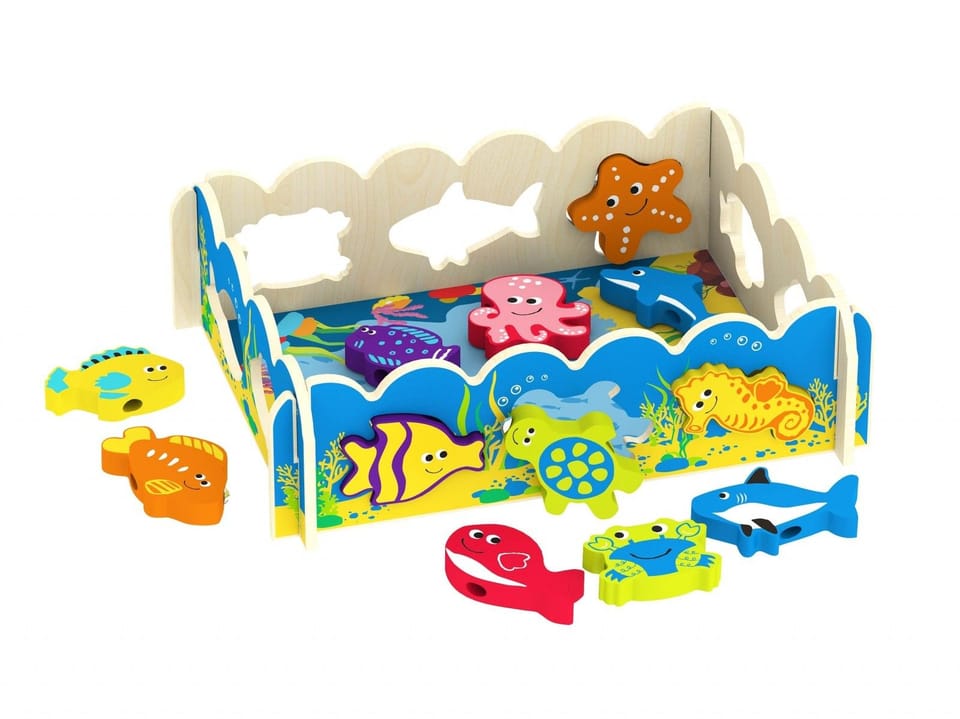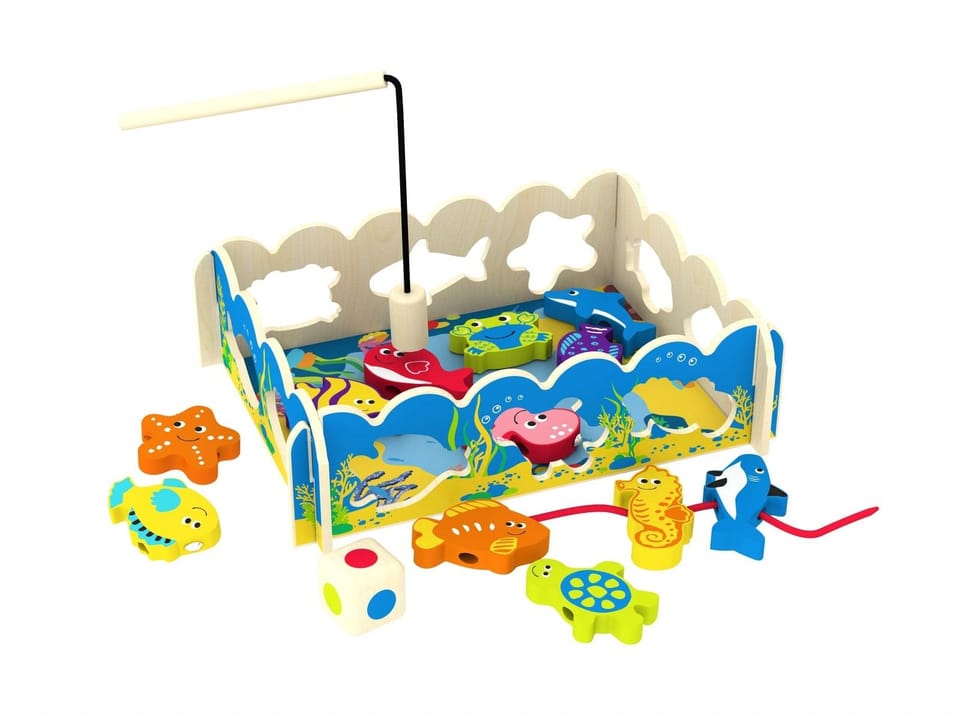 Gra Łowienie to drewniana zabawka która rozwija sprawne rączki, koordynację wzrokowo-ruchową i wyobraźnię przestrzenną.