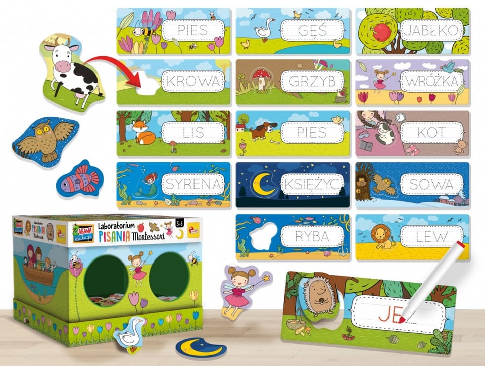 Szkoła Pisania to wiele słów do napisania specjalnym markerem zmazywalnym. Dzięki unikatowemu pudełku dotykowemu dziecko musi wyszukiwać przedmioty za pomocą zmysłu dotyku, a następnie wpisywać odpowiednie słowa. Ta gra oparta na metodzie Montessori polega na uczeniu się przez doświadczenie.