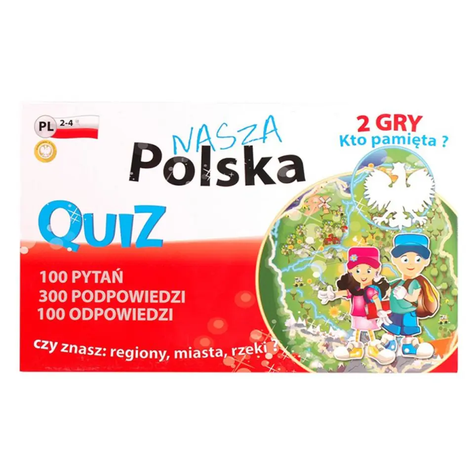 Gra quiz 2 w 1 nasza polska/kto pamięta? Edukacyjne gry planszowe dla 2 - 4 graczy Gra polega na wylosowaniu karty z pytaniem i kilkoma podpowiedziami, wśród nich znajduje się jedna prawidłowa odpowiedź, gracze zadają sobie pytania na przemian. Zwycięża ten kto poda najwięcej prawidłowych odpowiedzi. 2. Gra polega na odgadnięciu symboli z obrazków na planszy. W zestawie: -dwustronna plansza -12 pionków -1 kostka -100 kart z pytaniami i podpowiedziami -instrukcja Wymiary: - opakowania: 41 x 25 x 4 cm Wiek: 8+