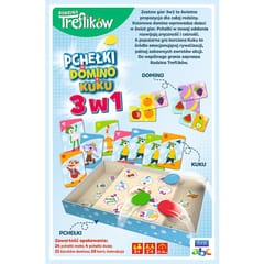Gra Trefliki 3w1 Domino Pchełki Kuku z Bohaterami Bajki Rodzina Treflików. Zestaw gier 3 w 1 to świetna propozycja dla całej rodziny. Kolorowe Domino wprowadza dzieci w świat gier. Pchełki w nowej odsłonie rozwijają zręczność i celność. A popularna gra karciana Kuku to źródło emocjonującej rywalizacji, pełnej zabawnych zwrotów akcji. Piękne, kolorowe ilustracje z pewnością umilą wszystkim zabawę, a dzięki niewielkiemu pudełku, które dodatkowo pełni funkcję tarczy w grze w pchełki, możecie zabrać je ze sobą wszędzie i zagrać, kiedy tylko będziecie mieć na to ochotę! Produkt jest jedną z wielu propozycji zabawek z serii Rodzina Treflików – animowanego serialu dla dzieci. Rodzina Treflików to polska produkcja, tworzona metodą poklatkową w gdyńskim Studio Trefl. Serial jest emitowany w stacjach telewizyjnych w kraju i za granicą.Ulubione postaci z bajki w łatwy sposób wprowadzą Twoje dziecko w świat gier. Cechy Gry:• Zestaw 3 klasycznych gier: Pchełki, Domino, Kuku• Wiele wariantów zabawy• Szybka, dynamiczna rozgrywka.• Proste zasady• Idealna dla dzieci od 3 roku życia•Zabawa dla całej rodziny. Gra rozwija:• Zręczność i celność• Cierpliwość• Umiejętność podejmowania decyzji• Zdolność zdrowego współzawodnictwa Poznaj Gry Trefl i podziel się radością z rozgrywki. Gry planszowe to doskonały prezent z okazji urodzin, Dnia Dziecka lub pod choinkę. Świetnie sprawdzą się podczas spotkania towarzyskiego oraz chwil spędzanych w gronie rodzinnym. Zawartość pudełka:• 24 pchełki małe• 4 pchełki duże• 21 klocków domino• 28 kart• Instrukcja Wymiary pudełka: 287x192x39 Ilość Graczy: 2 -4Średni czas rozgrywki: 25 -35 minWiek: 5+