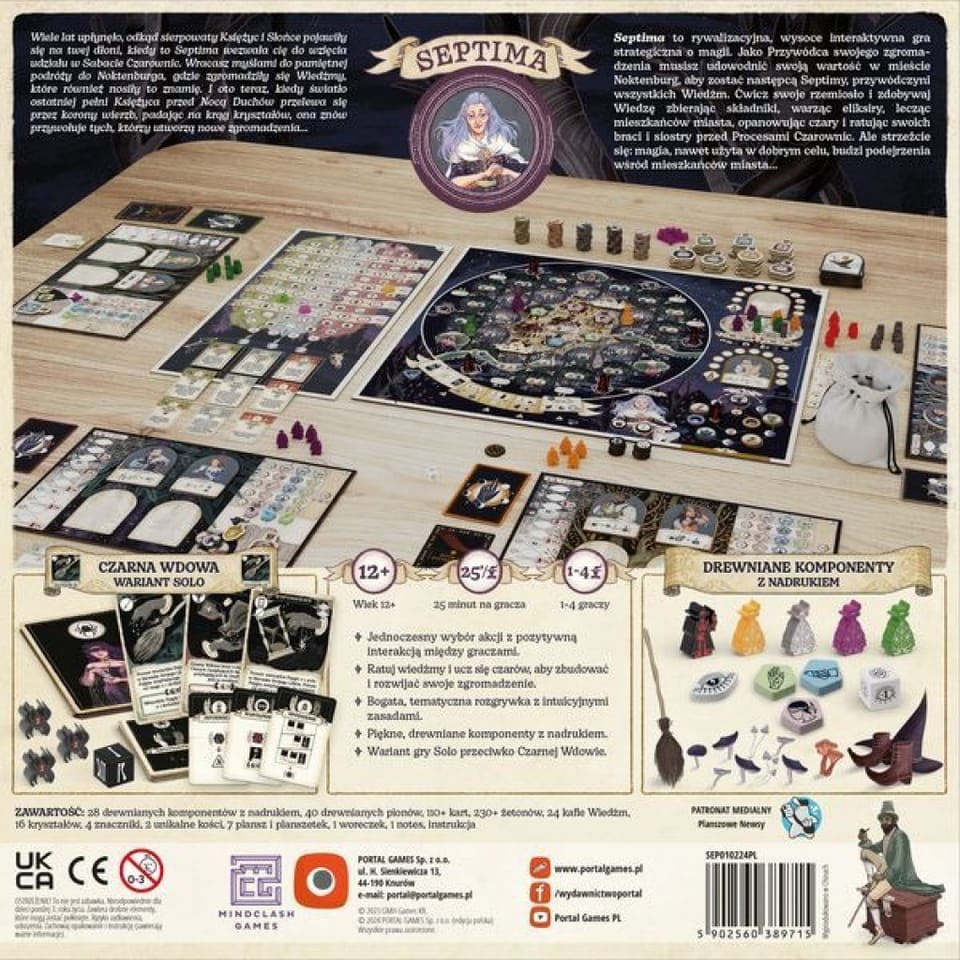 Pokieruj zgromadzeniem czarownic i zostań nową Septimą - pierwszą wśród wiedźm - w tej rywalizacyjnej, pełnej interakcji grze planszowej! Przed tobą wyzwanie, na które składa się zbieranie składników, warzenie eliksirów, pomoc mieszkańcom, rzucanie uroków i ratowanie sióstr i braci. Lecz strzeż się! Magia, nawet użyta w dobrej wierze, przyciąga złowrogich inkwizytorów.