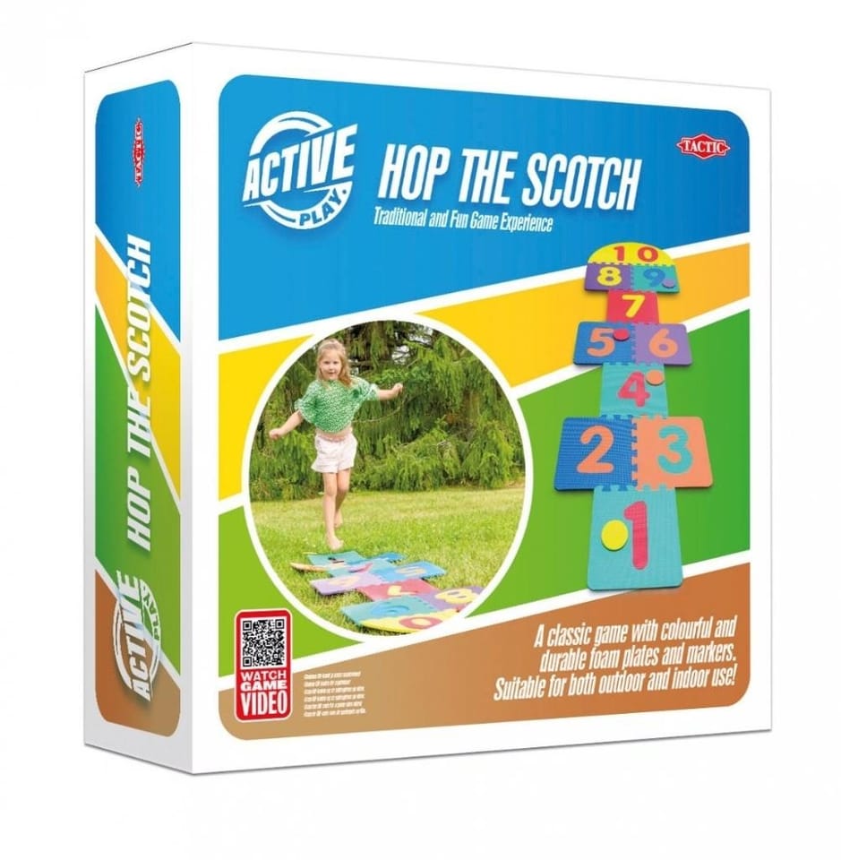 Klasyczna gra dla dzieci. Rzuć znacznikiem na pole i przeskocz przez pola, aby je odzyskać. Kolorowe piankowe płytki i markery. Idealny zarówno do wnętrz, jak i na zewnątrz.