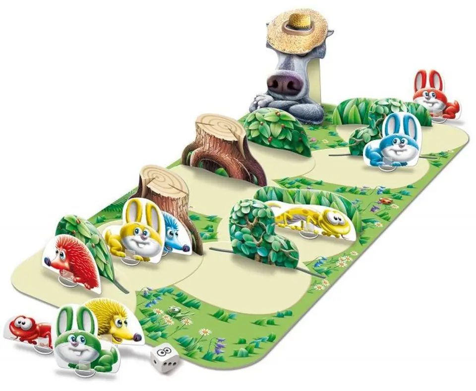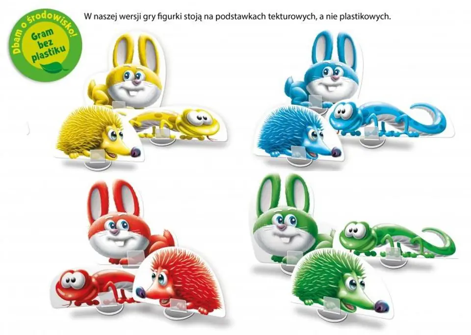 Raz, dwa, trzy Wilk patrzy Jeż pod krzak, zając pod drzewo – trwa zabawa w chowanego. Każde zwierzę dobrze wie, że przed wilkiem lepiej schować się. Wesoła, przygodowa gra rodzinna. Leśne zwierzątka bawiły się na polanie i nawet nie spostrzegły, jak zaczęło się ściemniać. Teraz muszą wrócić do swoich domków. Starają się przemknąć niepostrzeżenie, by nie obudzić wilka, który pechowo zasnął przy ścieżce. Pomóż im dotrzeć bezpiecznie do celu. Jak grać? Rzuć kostką Wypadła liczba? Wybierz zwierzątko, które się poruszy. Wypadły oczy wilka? Sprawdź, które zwierzątka zdołały się schować. Zawartość pudełka: -plansza -12 zwierzątek (4 zestawy po 3) -12 tekturowych podstawek (oraz elementy zapasowe) -4 elementy ścieżki (krzaki/pnie) -wilk z kapeluszem -kostka -instrukcja Wymiary: 260x260x80 mm Wiek: 3+