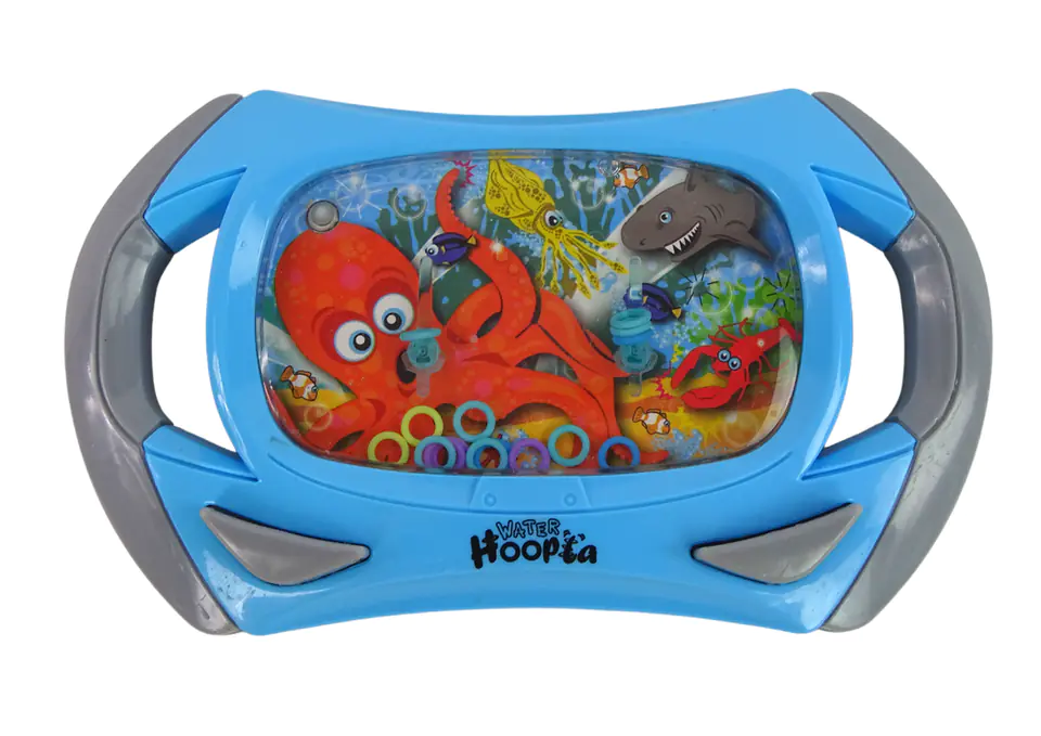 Zabawka wodna ma kształt konsoli w kolorach szarym i niebieskim. Wewnątrz znajduje się grafika podwodnego świata, w tle ośmiornica, rekin i meduza.