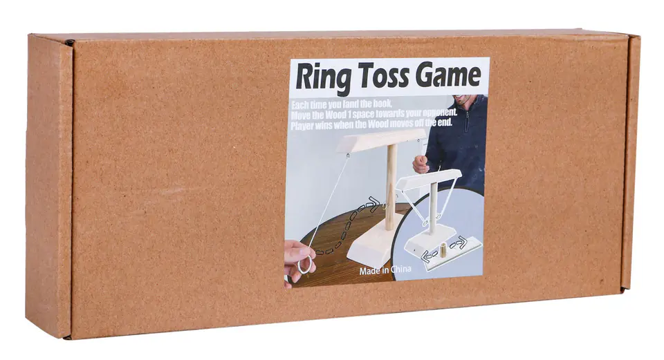 Drewniana, zręcznościowa, wciągająca gra dla dzieci od 5-go roku życia, ale także dla dorosłych.Idealna na imprezy, spotkania integracyjne, wakacje. Zapewni wiele godzin rozrywki i poprawi koordynację ręka-oko. Łatwa w montażu i demontażu, starannie wykonana i całkowicie wyjątkowa. Polega na tradycyjnym rzucie pierścieniem, tak by wylądował na ringu (haczyku). Po każdym udanym rzucie, należy przesunąć kołek na podstawie z kółeczkami w stronę przeciwnika. Kto pierwszy dotrze do przeciwnika wygrywa. Uwaga w wersji dla dorosłych kołek można zastąpić kieliszkiem. Zasady gry: - drewniany kołek połóż na środku podstawki, - spróbuj trafić metalowym pierścieniem, tak by wylądował na haczyku, - gdy trafisz, przesuń drewniany kołek o 1 pole w kierunku przeciwnika, - gdy nie trafisz, ruch ma przeciwnik, - wygrywa ten, kto pierwszy dotrze do przeciwnika. | |