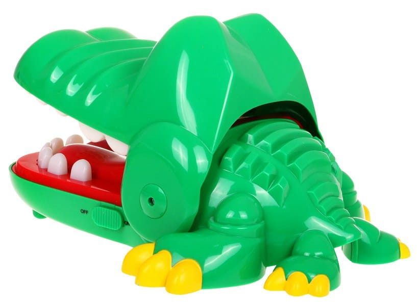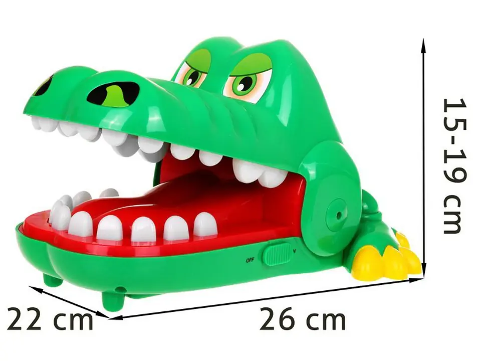 Krokodyl otwiera odważnie paszczę i widzimy rząd pięknych i równych ząbków, niestety wśród nich znajduję się jeden bolący. W tym celu naciskaj palcem pojedynczo na dowolny ząbek (przy większej ilości graczy robimy to po kolei). 3 WARIANTY GIER: 1. BOLĄCY ZĄB - czerwony przycisk - uruchamia pierwszy z wariantów gier. - po jego naciśnięciu przystępujemy do zabawy: naciskaj po kolei ząb za zębem... jeśli trafisz na bolącego zęba krokodyl ugryzie ! Oznacza przegranom. 2. GRA NA REFLEKS: - naciśnij ząb emitujący pomarańczowe światełko, - naciskaj szybko zęby, które podświetlają się kolejno, szybkość podświetlania będzie się zwiększać, - jeśli zaświecą się dwa zęby jednocześnie spróbuj nacisnąć je jeden po drugim, najszybciej, jak to możliwe, - jeśli trzykrotnie źle naciśniesz, krokodyl zamknie paszczę, przegrałeś, koniec gry. - po zakończeniu gry liczba świecących zębów będzie Twoim stopniem refleksu. 3) ZAPAMIĘTYWANIE: - naciśnij ząbek świecący na zielono, - zapamiętaj świecące zęby, - kiedy krokodyl zapyta "Which tooth hurts" (który ząb boli) naciskaj zapamiętane zęby, - możesz spróbować kolejny raz, jeśli Twoja odpowiedź będzie poprawna, - ilość podświetlanych zębów wzrośnie, a czas ich świecenia będzie coraz krótszy. - jeśli źle odpowiesz zamknie się paszcza krokodyla i ugryzie paluszek. | |