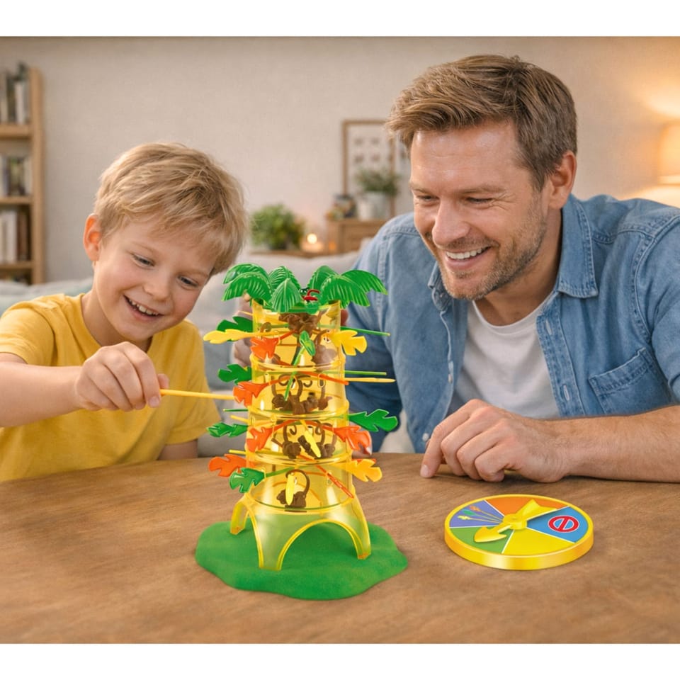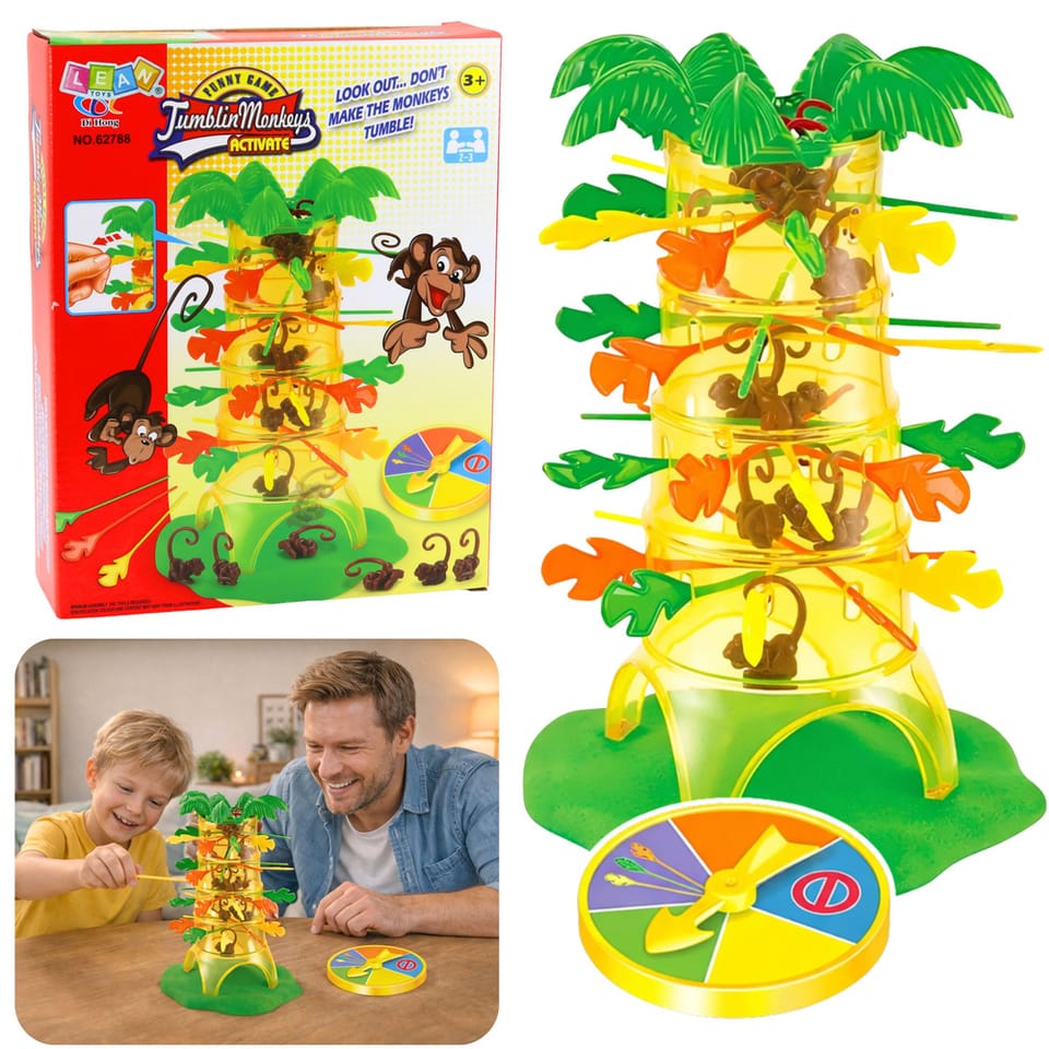 Gra zręcznościowa Spadające Małpki to emocjonująca zabawa dla całej rodziny, która łączy elementy strategii, koncentracji oraz zręczności. Kolorowe drzewo z gałęziami i zawieszonymi małpkami przyciąga uwagę dzieci i zachęca do wspólnej rozgrywki pełnej napięcia i śmiechu.