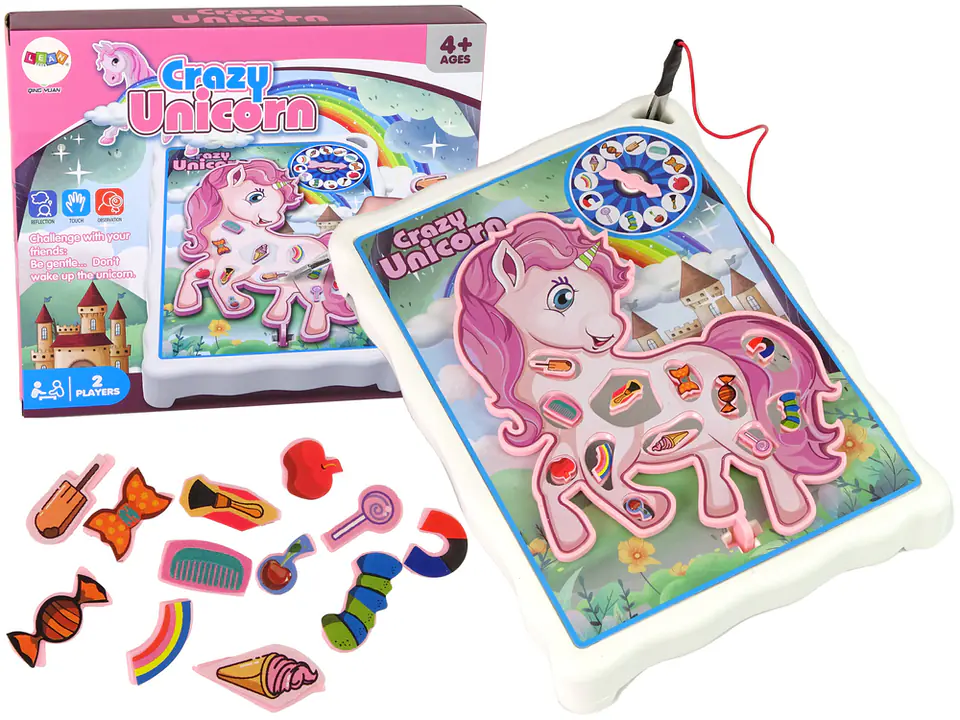 Na planszy znajduje się 12 różnych miejsc na ciele jednorożca, na których należy położyć małe elementy lub jedzenie. Następnie zakręcasz kołem i czekasz na wskazówkę strzałki. Twoim zadaniem jest ostrożnie wyciągnąć element z danej części ciała. Ale uważaj! Jednorożec jest bardzo wrażliwy i wystarczy, że lekko dotkniesz jego powierzchni, aby zaczął brzęczeć i przegrywasz. Twoim celem jest zakończenie gry, nie obudzając jednorożca.